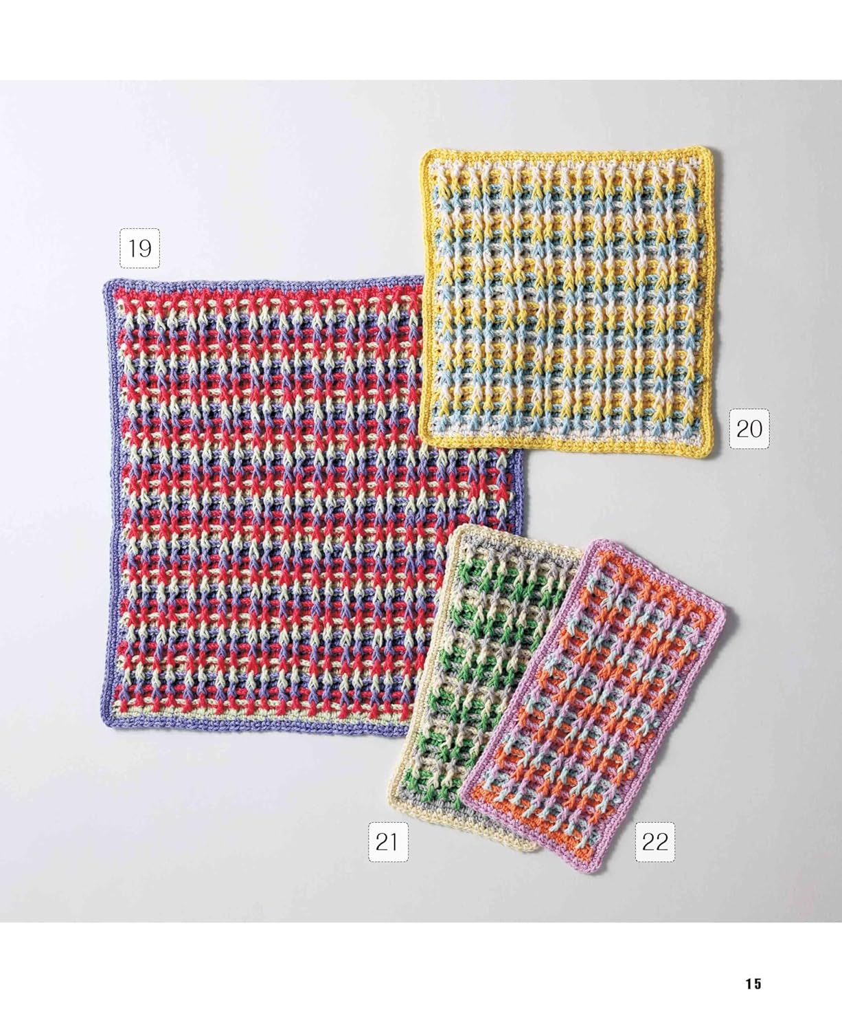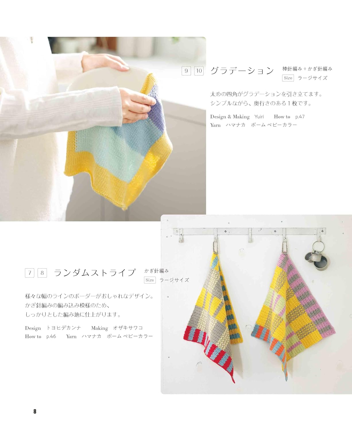 All works are made with cotton thread, which is soft to the touch and can be washed and reused, and includes stick-knit and crochet works.