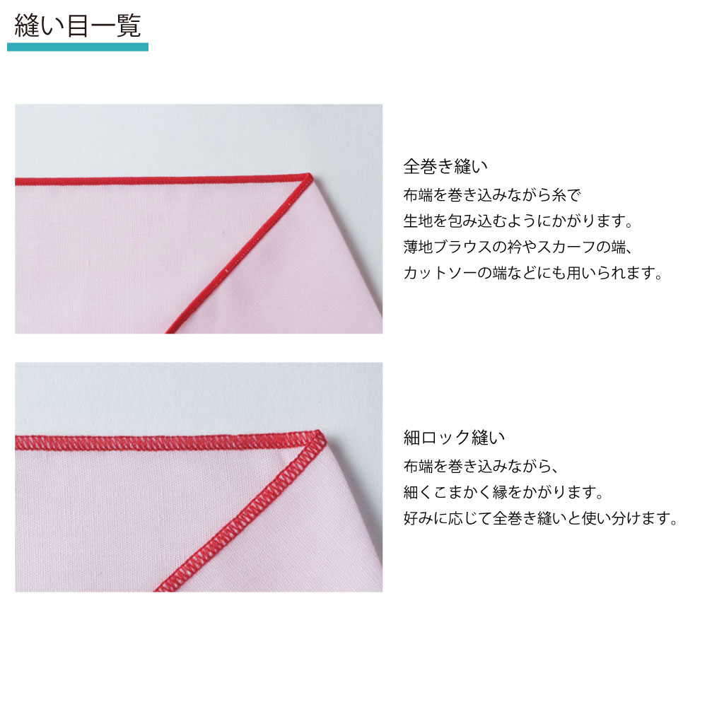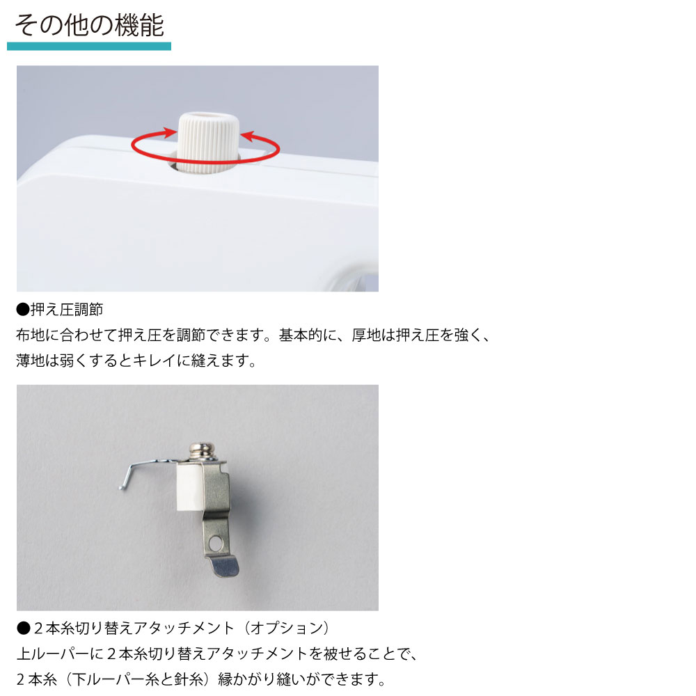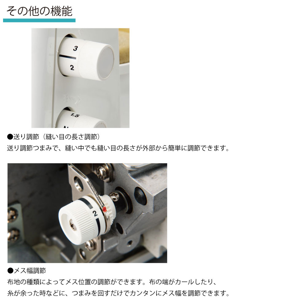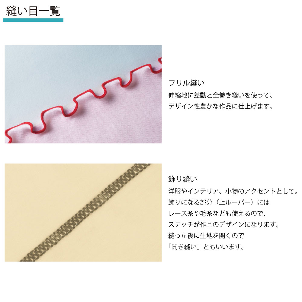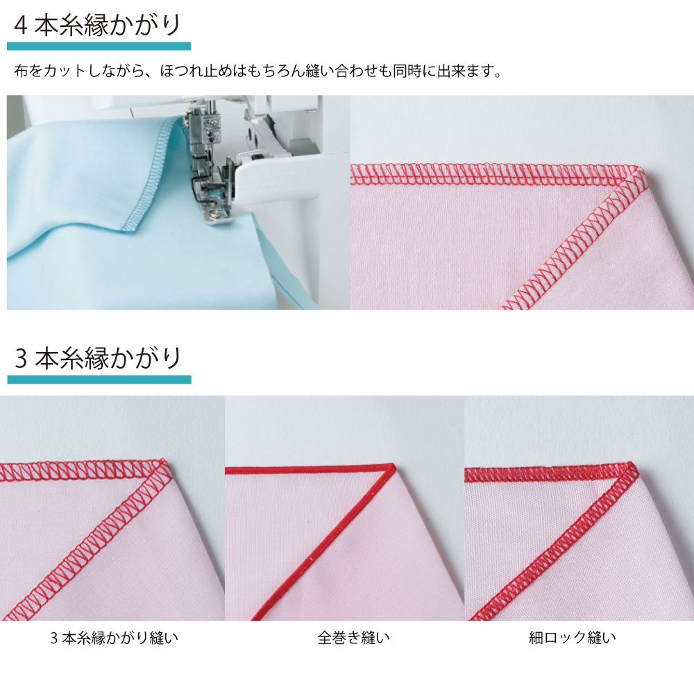 かがり幅 | ・4本糸/5~7mm ・3本糸/右針:3~5mm、左針:5~7mm(巻き縫い:1.8~2.2mm) |