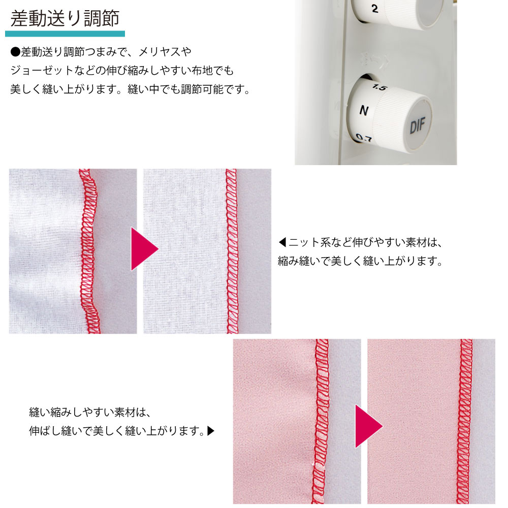 ●差動送り調節つまみで、メリヤスやジョーゼットなどの伸び縮みしやすい布地でも美しく縫い上がります。縫い中でも調節可能です。