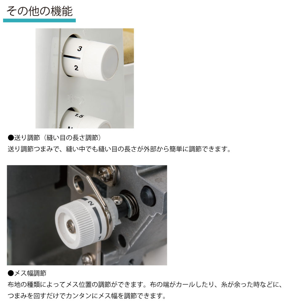 布地の種類によってメス位置の調節ができます。布の端がカールしたり、糸が余った時などに、つまみを回すだけでカンタンにメス幅を調節できます。