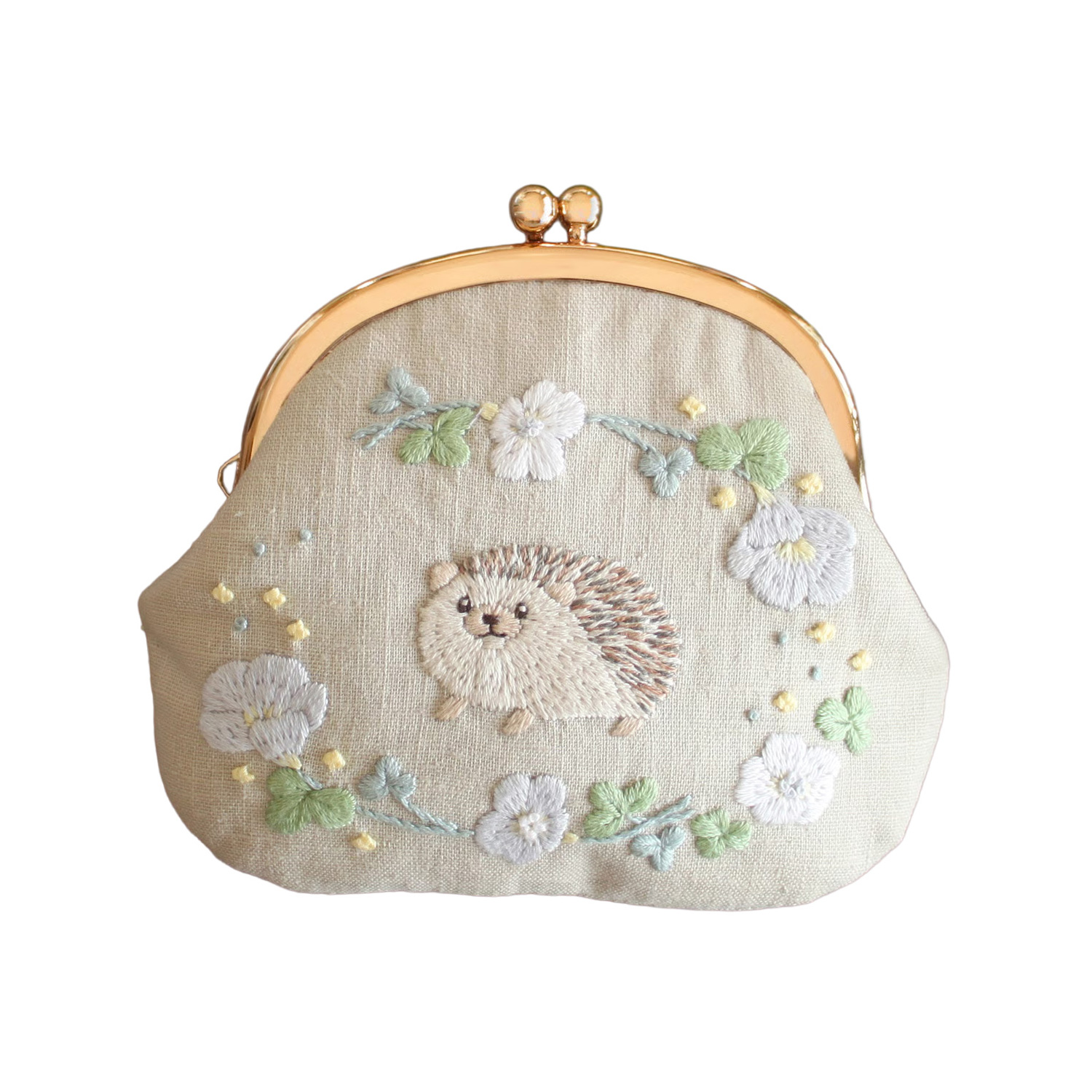 PHC-131-1  chicchiさんの動物刺繍キット[図案印刷済] -はりねずみさんとオキザリスのがま口-(袋)