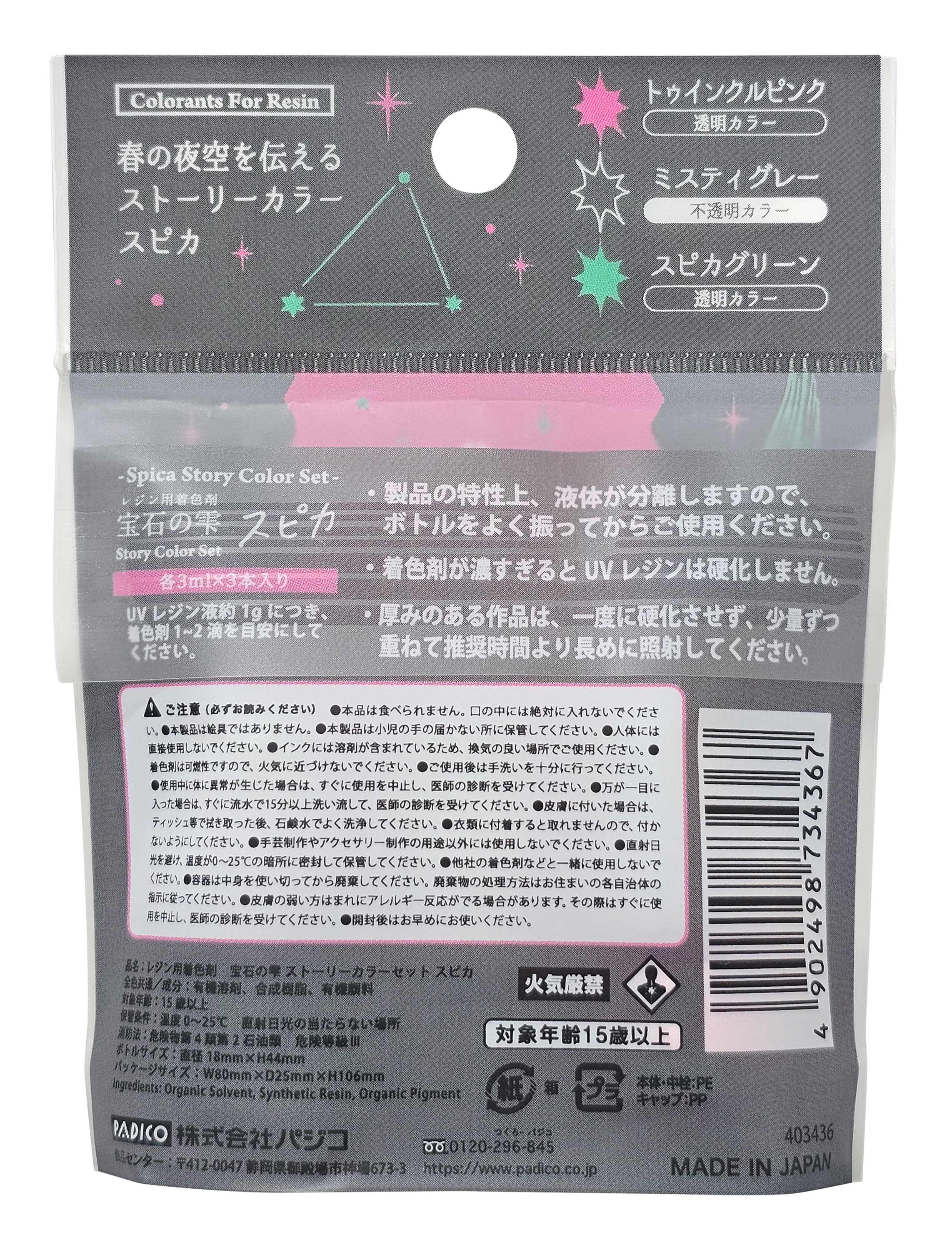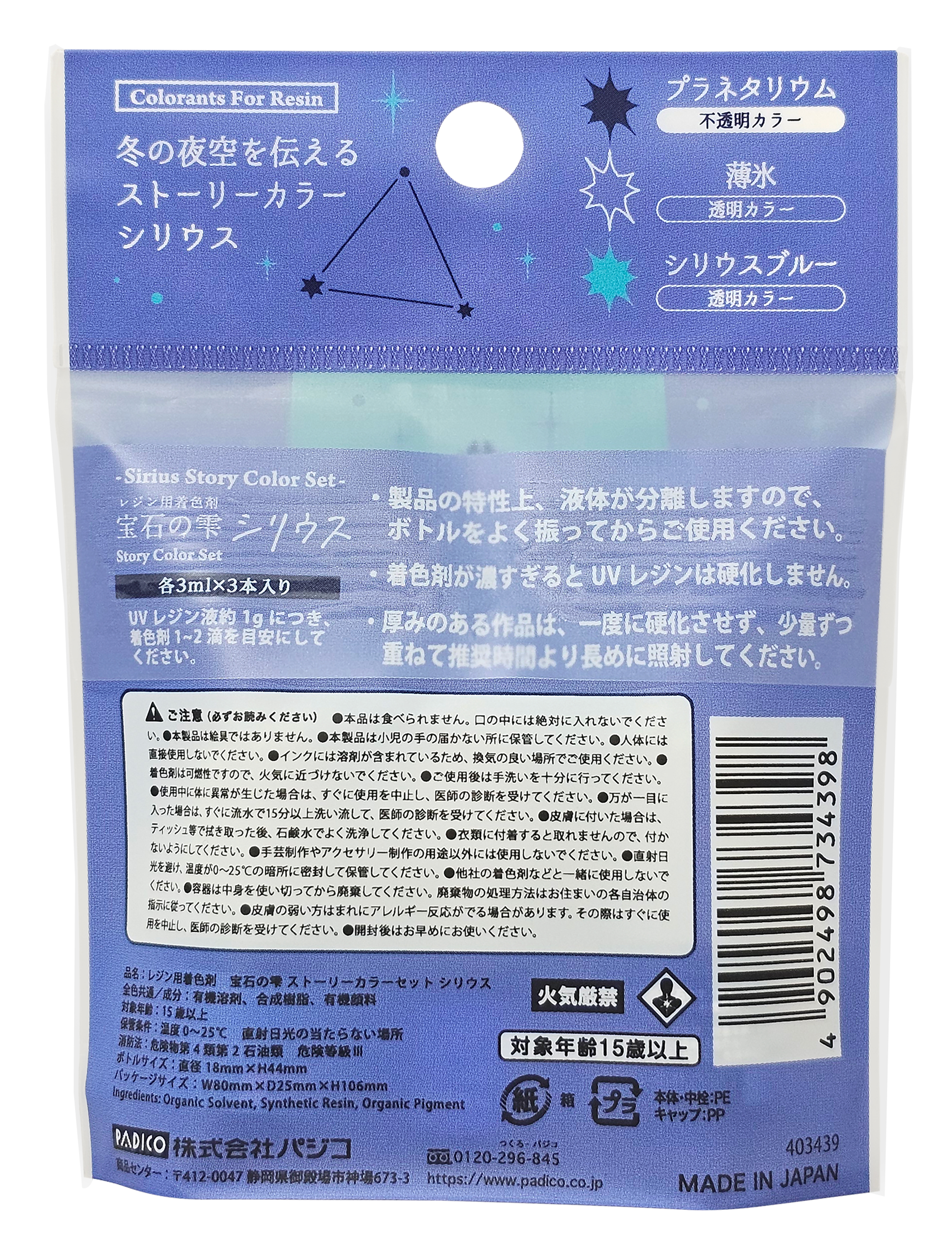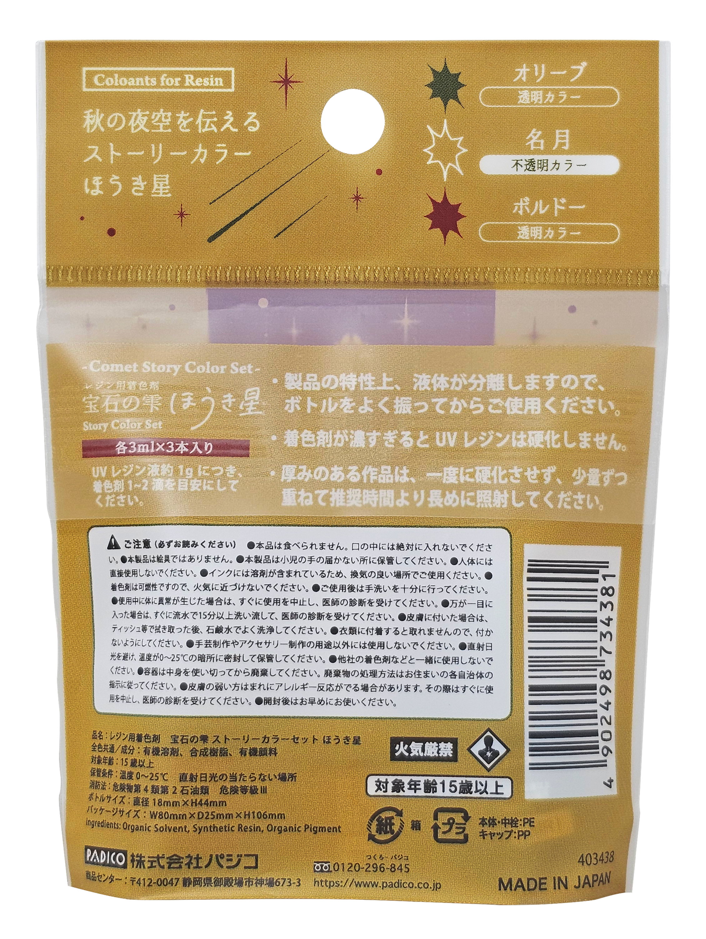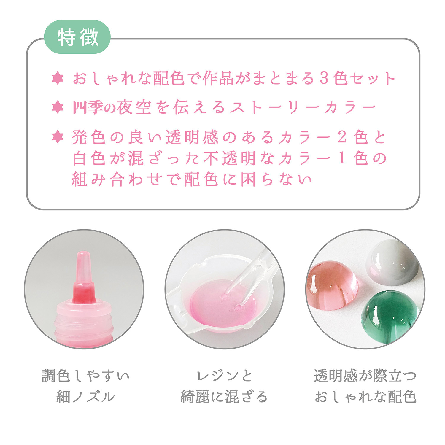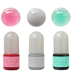 ・着色剤が濃すぎると UV-LED レジンは硬化しません。UV-LED レジン液約1gにつき、着色剤1~2滴を目安にしてください。