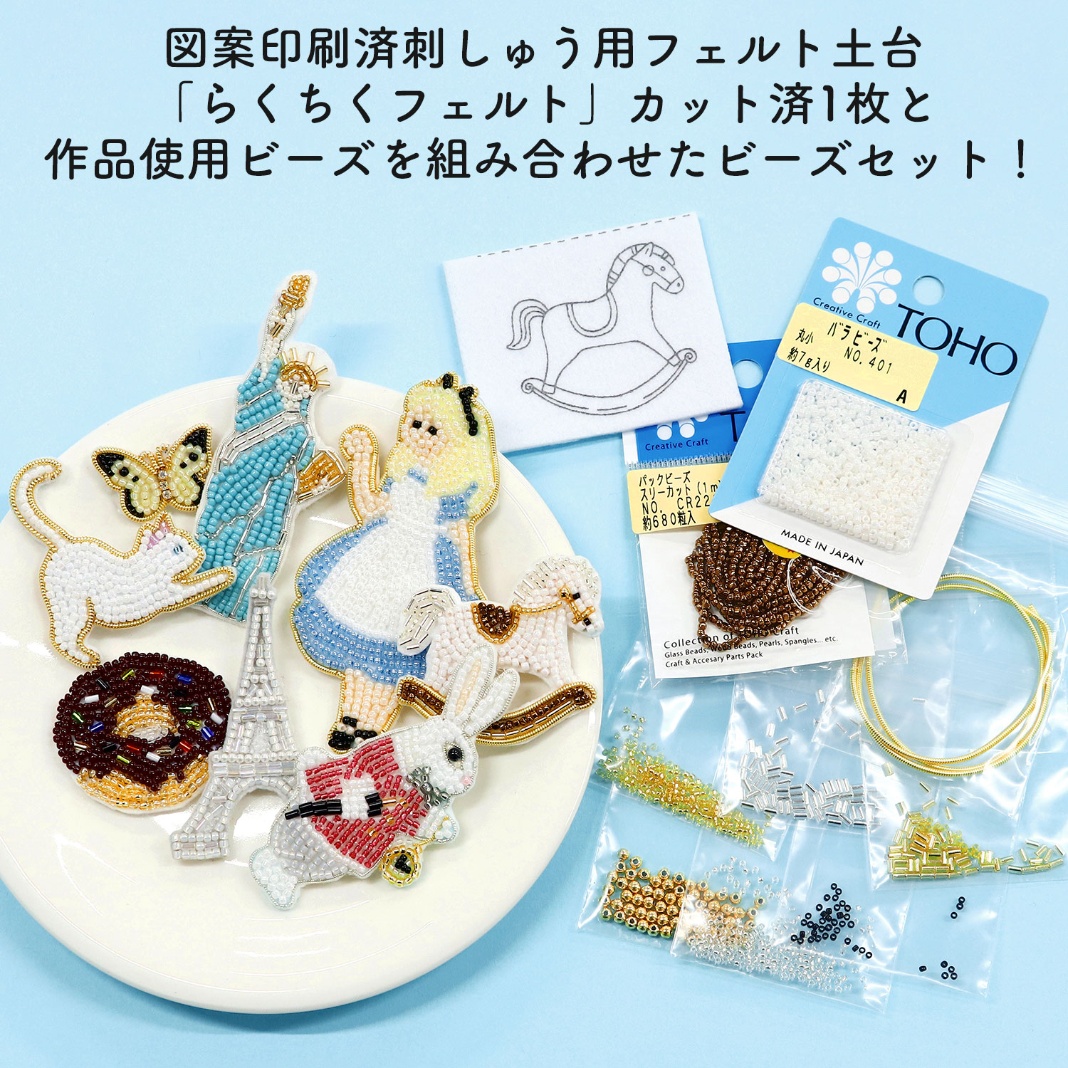 図案印刷済刺しゅう用フェルト土台「らくちくフェルト」カット済1枚と作品使用ビーズを組み合わせたビーズセット。