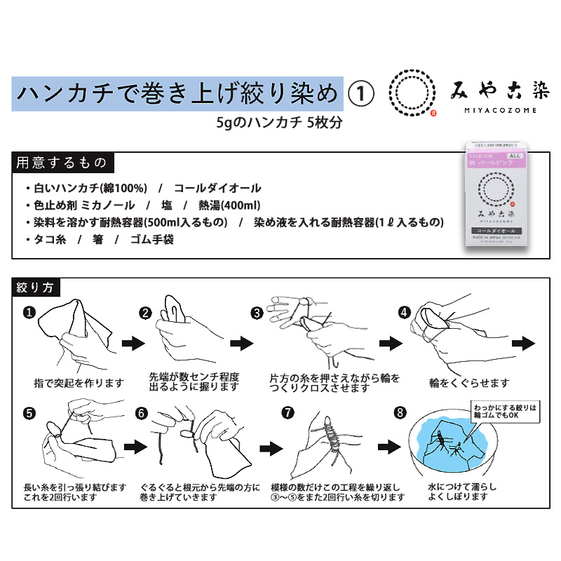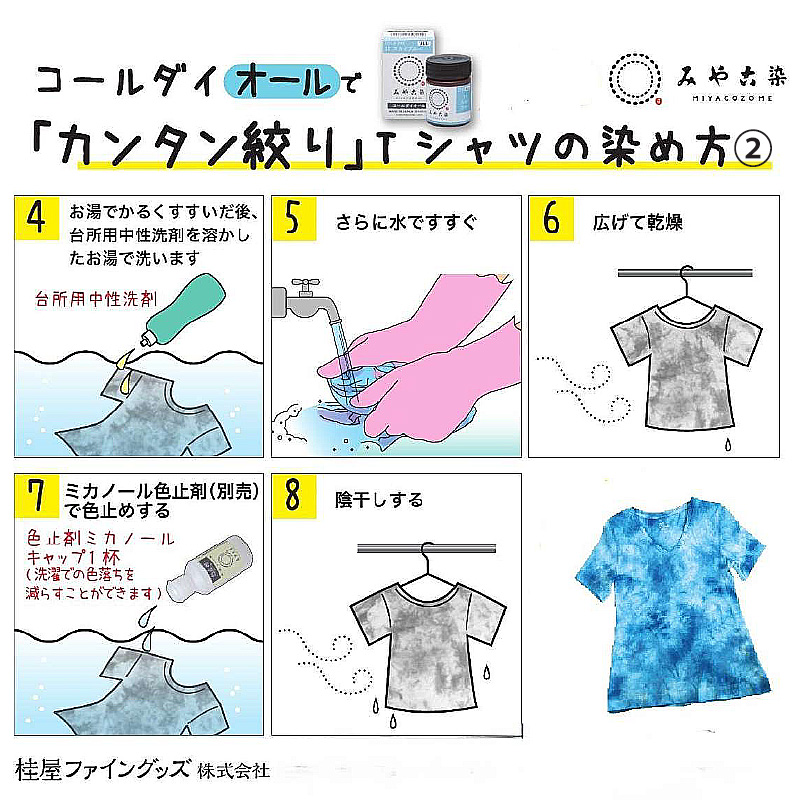 綿・レーヨン(キュプラ)・絹・毛・ナイロン・ポリウレタン・ビニロンが水(30℃以上)でも染まる染料です。1瓶で約250gの白生地(Tシャツ約2枚またはブラウス約2枚)は染められます。