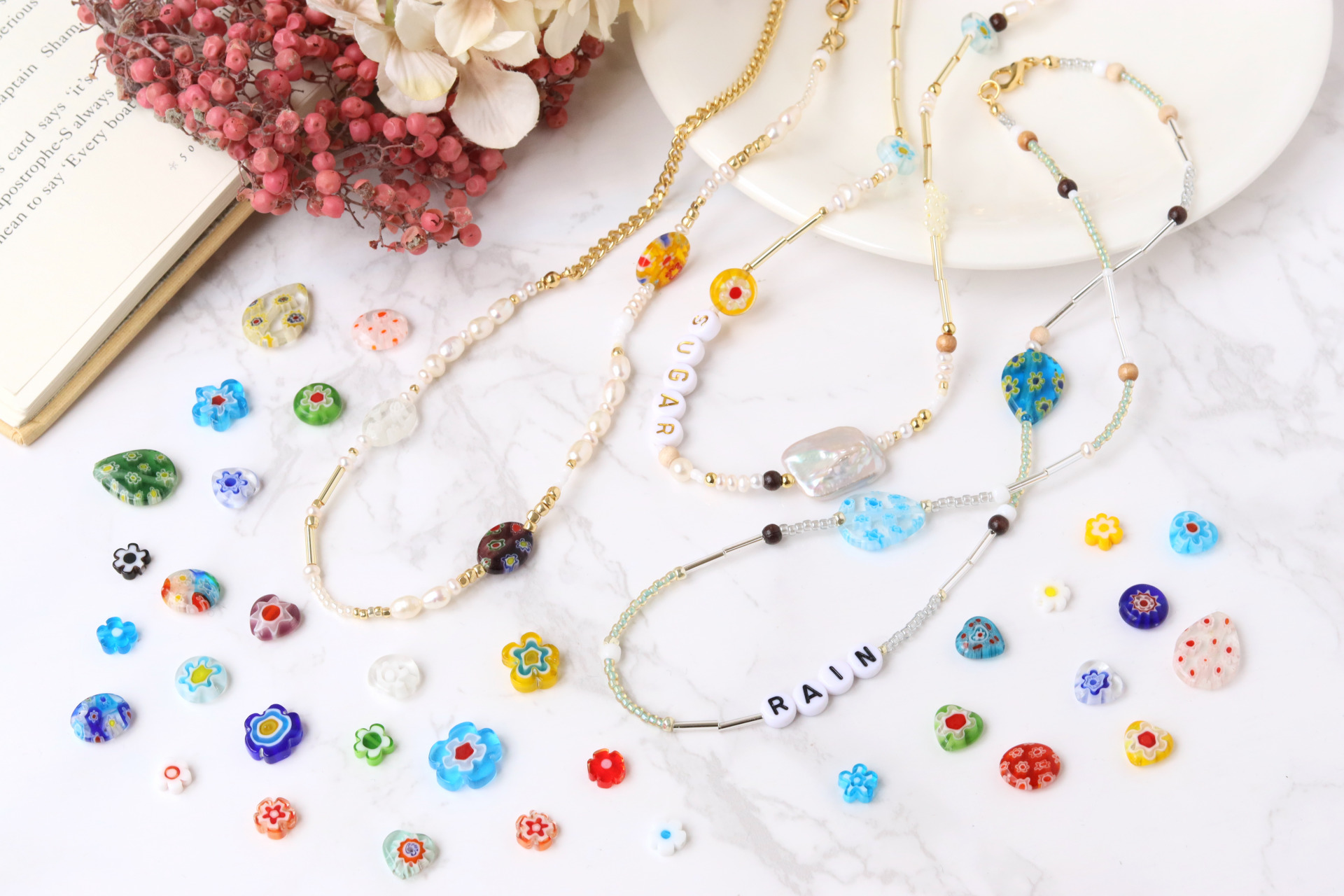 ベネチアンガラスの美しいビーズでお気に入りのネックレスやブレスレット作りを楽しんでみてくださいね。