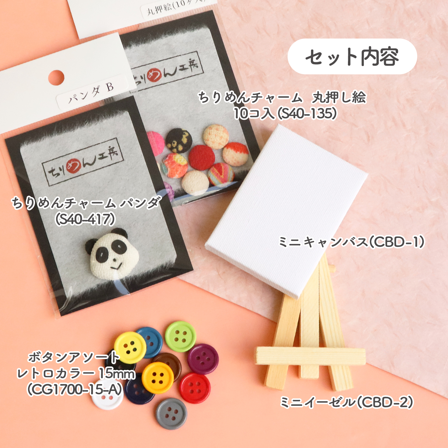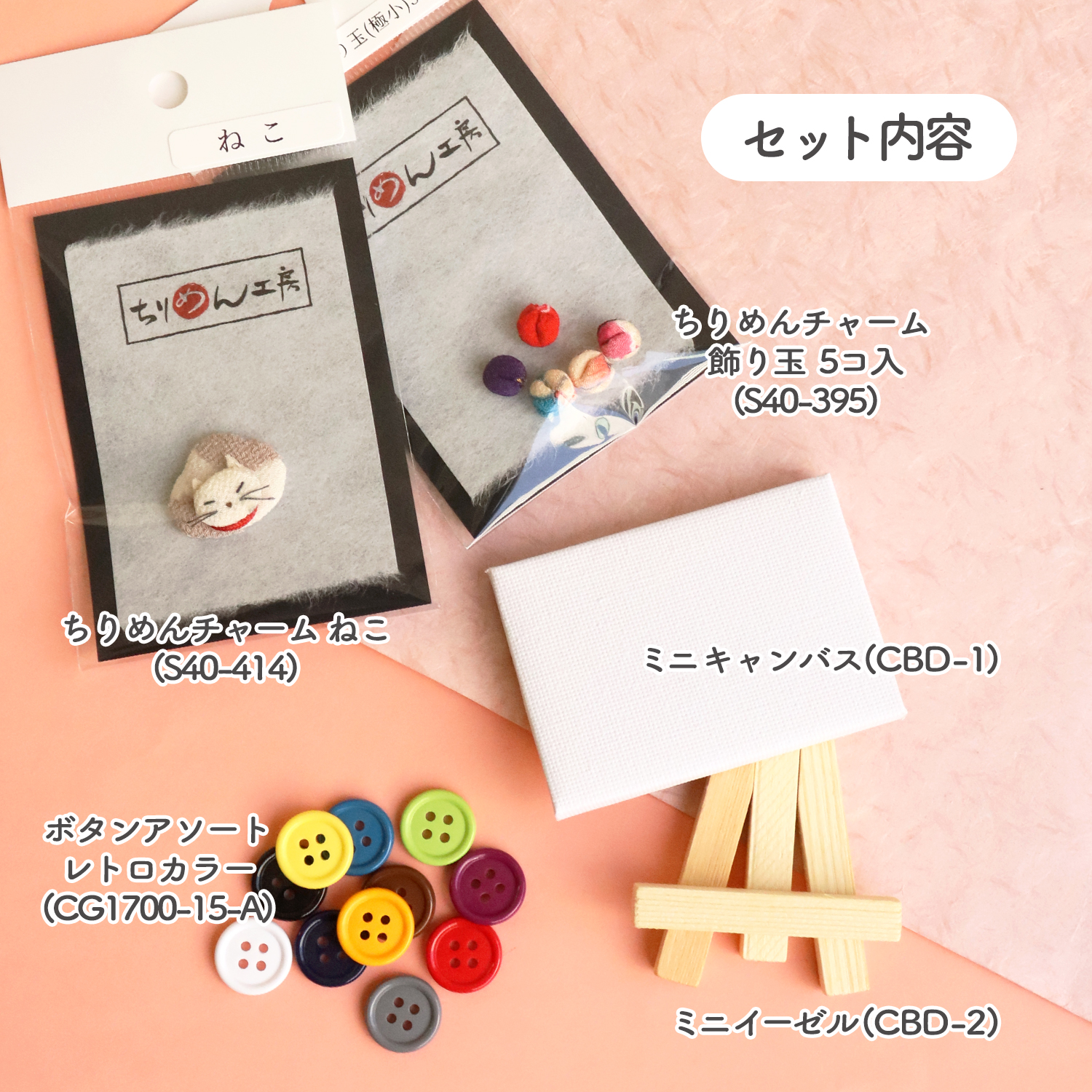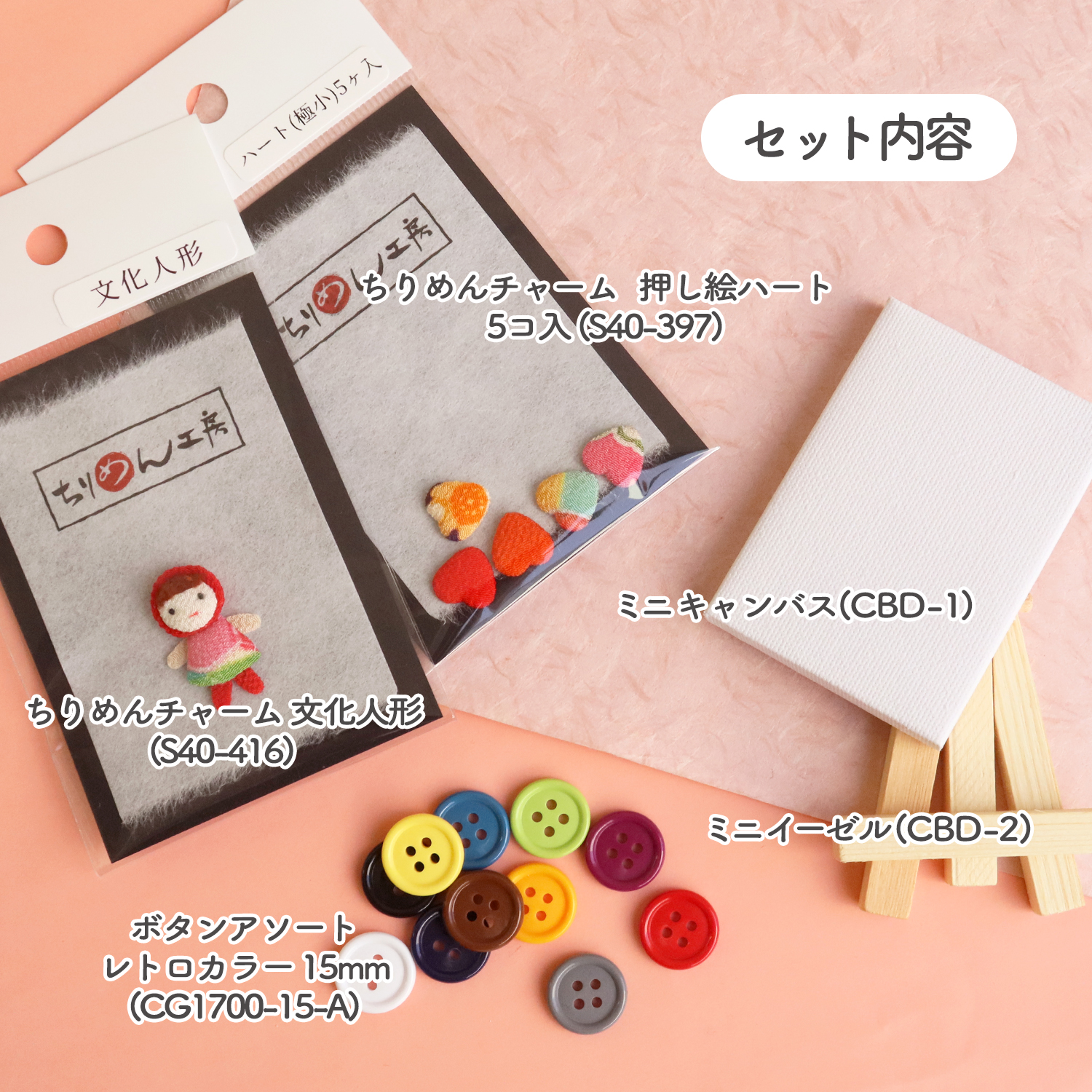 小さくて可愛いちりめんパーツと、カラフルなボタンが入っているミニキャンバスのセットです。