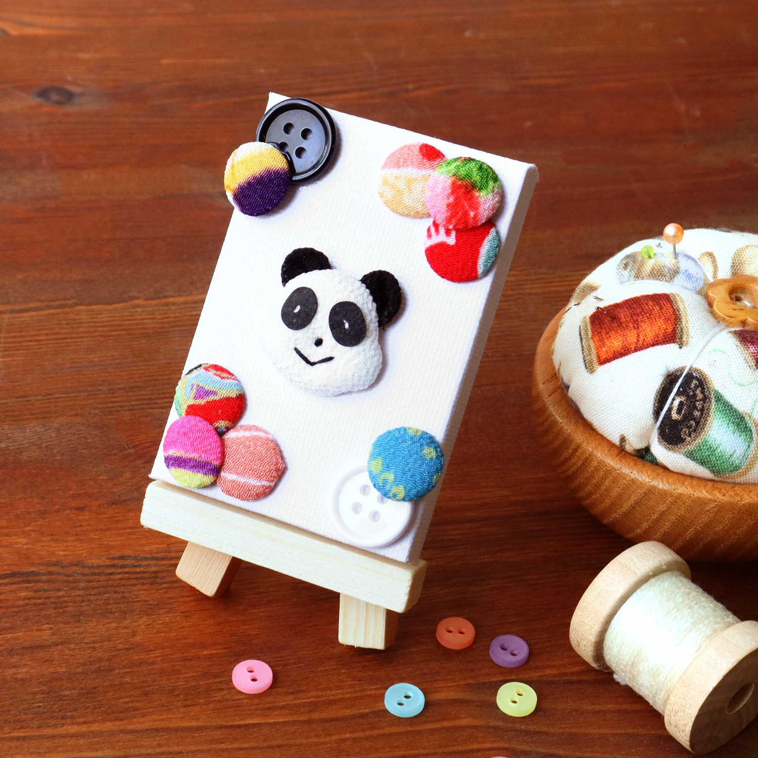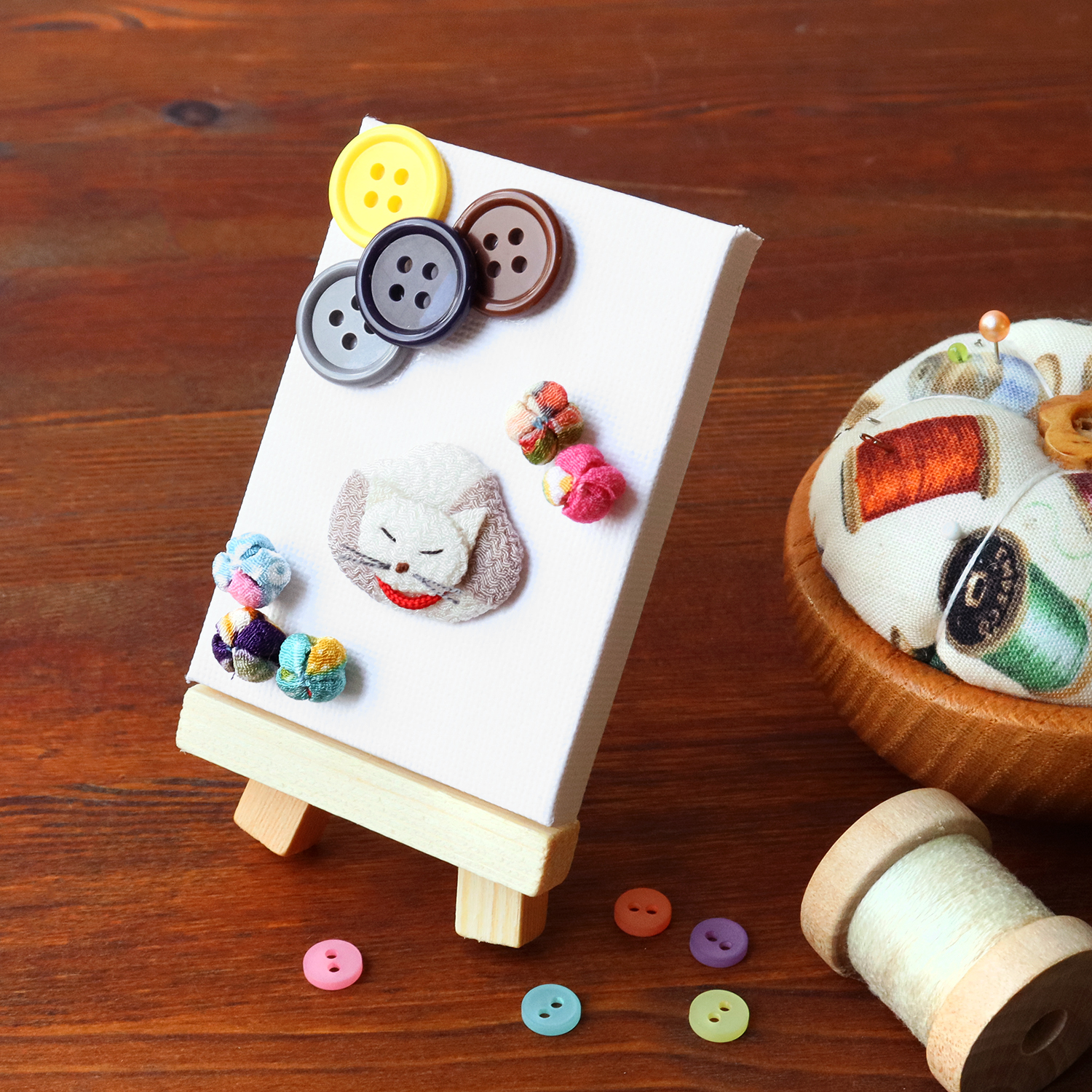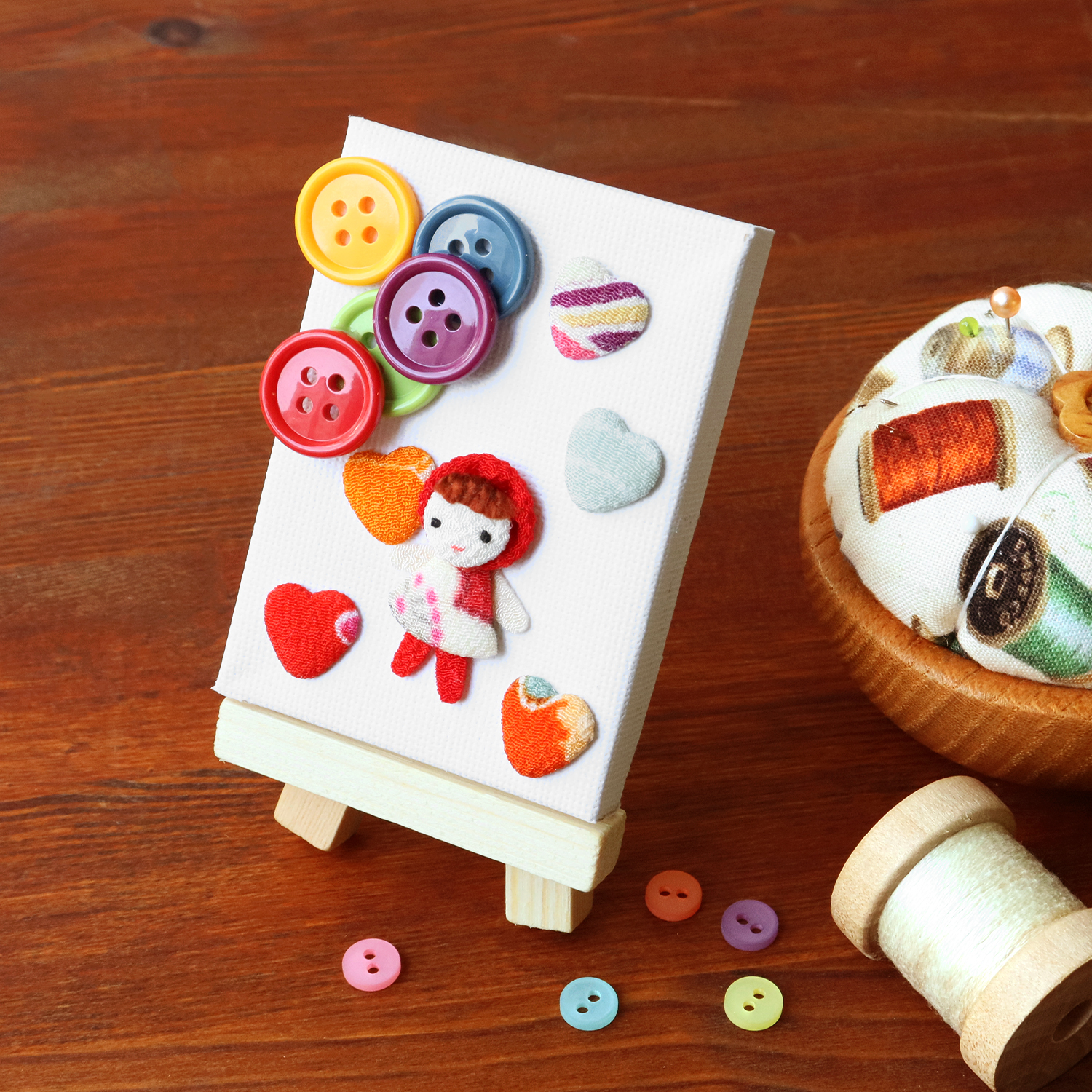 小さくて可愛いちりめんパーツと、カラフルなボタンが入っているミニキャンバスのセットです。