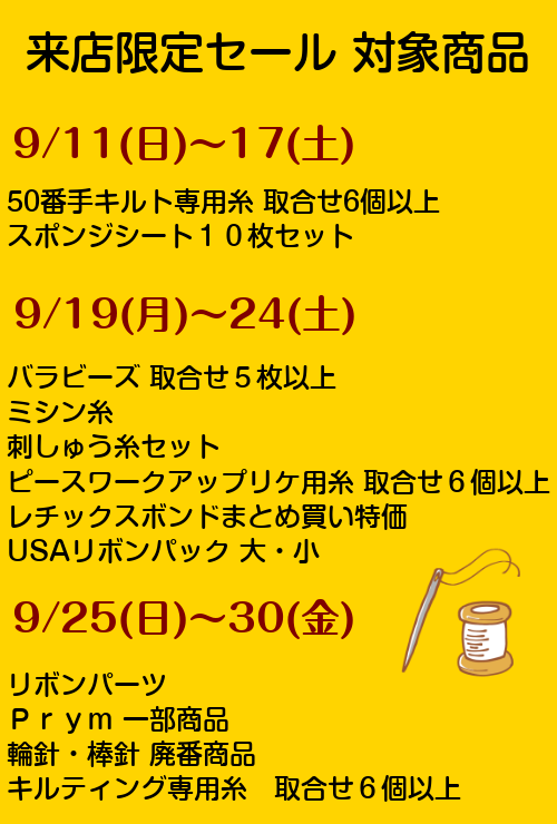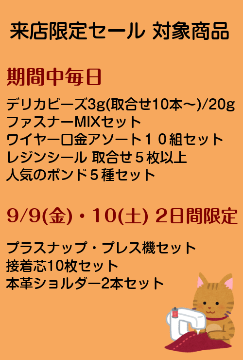 9/9(金)~9/30(金)の期間中、店頭にてセールを開催いたします!