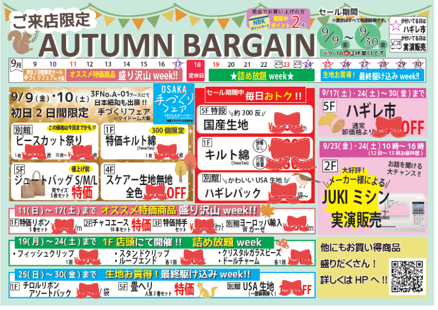 【大好評 ハギレ市】9/17(土)・24(土)~30(金)