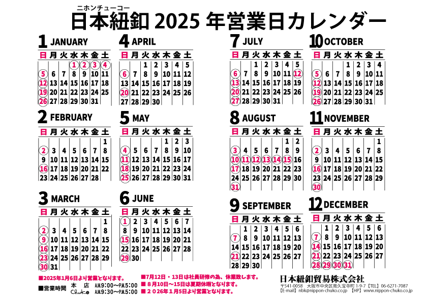 日本紐釦 ホーム > 日本紐釦ブログ > 会社情報 > 営業カレンダー > 2025年度 日本紐釦営業カレンダー Chuko Blog 会社情報 2025年度 日本紐釦営業カレンダー 2023-11-07 営業カレンダーお知らせ会社情報 日本紐釦貿易 営業カレンダーお知らせ会社情報 Author 日本紐釦貿易 年末年始休業日のご案内 一覧へ戻る 年末年始休業日のご案内 Eventsイベント情報 一覧を見る 2025-11-25ピックアップ 2025年12月大見切り市のお知らせ【ご来店限定】 #ガチャガチャ #輸入生地 #ハギレ市 イベント情報 2025-11-20 【2026年】全国のフリーマーケット・マルシェ開催情報のまとめ #イベント #ハンドメイドイベント #展示会 展示会 2025-11-12ピックアップ 【2026年】全国の手芸・ハンドメイドクラフトイベント・展示会まとめ 展示会 2025-11-09ピックアップ 【11/10~24】オンライン限定!「木馬リボン受注会」開催いたします! #バーゲン #Instagram #リボン イベント情報 2025-11-07 【2025年】全国の手芸・ハンドメイドクラフトイベント・展示会まとめ イベント情報 2025-11-06 「パッチワーク教室特別号 2025~2026年」にて弊社のスタンド付き羽子板をご使用いただきました #ハンドメイド #手芸本 #手芸 メディア掲載 2025-11-06新商品 「オックス生地で広がるハンドメイドの楽しさ|種類別におすすめ作品をご紹介」 #ハンドメイド #手芸本 #手芸 紐釦コラム 2025-11-06新商品 COTTON TIME(コットンタイム)2025年11月号で「押さえ付マグネット定規」をご使用いただきました #COTTON TIME #ハンドメイド #定期本 メディア掲載 2025-11-25ピックアップ 2025年12月大見切り市のお知らせ【ご来店限定】 #ガチャガチャ #輸入生地 #ハギレ市 イベント情報 2025-11-20 【2026年】全国のフリーマーケット・マルシェ開催情報のまとめ #イベント #ハンドメイドイベント #展示会 展示会 2025-11-12ピックアップ 【2026年】全国の手芸・ハンドメイドクラフトイベント・展示会まとめ 展示会 2025-11-09ピックアップ 【11/10~24】オンライン限定!「木馬リボン受注会」開催いたします! #バーゲン #Instagram #リボン イベント情報 一覧を見る Products商品情報 一覧を見る 2025-11-25商品解説ピックアップ 玄関用の手づくり正月飾りはこれ!人気デザインと材料がすぐ分かる完全ガイド #初心者 #ちりめん #新年 紐釦コラム 2025-11-21ピックアップ新商品 ケイト・グリナウェイ生地の魅力を解説!絵本のようなデザインとおすすめ活用アイデア #生地 #花柄 #プリント生地 紐釦コラム 2025-11-18商品解説ピックアップ 【刺し子用品に新アイテム登場】実用性アリのトリプルガーゼハンカチ #刺し子 #ハンカチ #トリプルガーゼ 紐釦コラム 2025-11-17 【2025年11月更新】~刺し子図案ダウンロードプレゼント~ #刺し子 #刺しゅう #晒 商品情報 2025-11-14商品解説ピックアップ 🧵糸通しどれを選ぶ?初心者さんでも失敗しないおすすめご紹介! #糸通し #デスクスレダー #バーディ 紐釦コラム 2025-11-11手芸のきほんピックアップ 初心者さんにもおすすめ♪リボンの結び方5選(動画付き) #リボン #刺繍リボン #インド刺繍リボン 紐釦コラム 2025-11-06 「パッチワーク教室特別号 2025~2026年」にて弊社のスタンド付き羽子板をご使用いただきました #ハンドメイド #手芸本 #手芸 メディア掲載 2025-11-06新商品 「オックス生地で広がるハンドメイドの楽しさ|種類別におすすめ作品をご紹介」 #ハンドメイド #手芸本 #手芸 紐釦コラム 2025-11-25商品解説ピックアップ 玄関用の手づくり正月飾りはこれ!人気デザインと材料がすぐ分かる完全ガイド #初心者 #ちりめん #新年 紐釦コラム 2025-11-21ピックアップ新商品 ケイト・グリナウェイ生地の魅力を解説!絵本のようなデザインとおすすめ活用アイデア #生地 #花柄 #プリント生地 紐釦コラム 2025-11-18商品解説ピックアップ 【刺し子用品に新アイテム登場】実用性アリのトリプルガーゼハンカチ #刺し子 #ハンカチ #トリプルガーゼ 紐釦コラム 2025-11-17 【2025年11月更新】~刺し子図案ダウンロードプレゼント~ #刺し子 #刺しゅう #晒 商品情報 一覧を見る Trending Tags人気のタグ 全て表示 ナチュラル本Cotton fabric商品解説別館Chukoトレンド手芸手芸のきほん実演販売作り方講座ハンドメイド体験ショルダー道具のはなし刺しゅうパッチワークビーズソーイング缶バッジ花インテリア休業日レトロリボンソーイング用品手作りブラウス Blog Categoriesブログカテゴリー 日本紐釦ブログ English ご来店に関して 重要なお知らせ お知らせ イベント情報 会社情報 卸売・仕入れ 紐釦コラム 商品情報