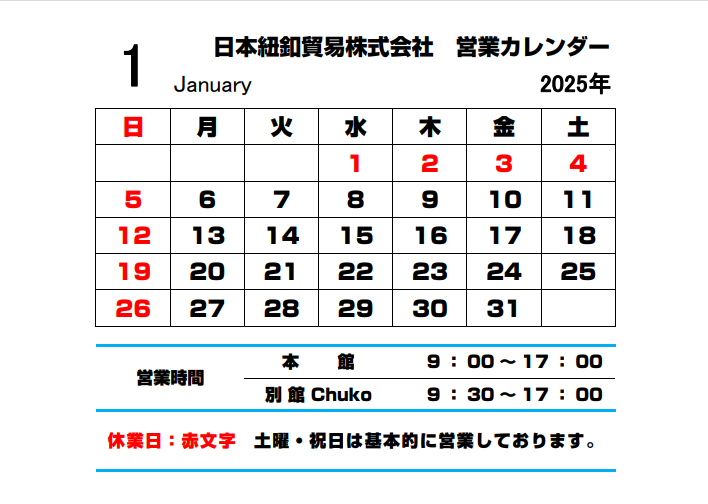 1月1日~5日と毎週日曜日はお休みをいただいております。