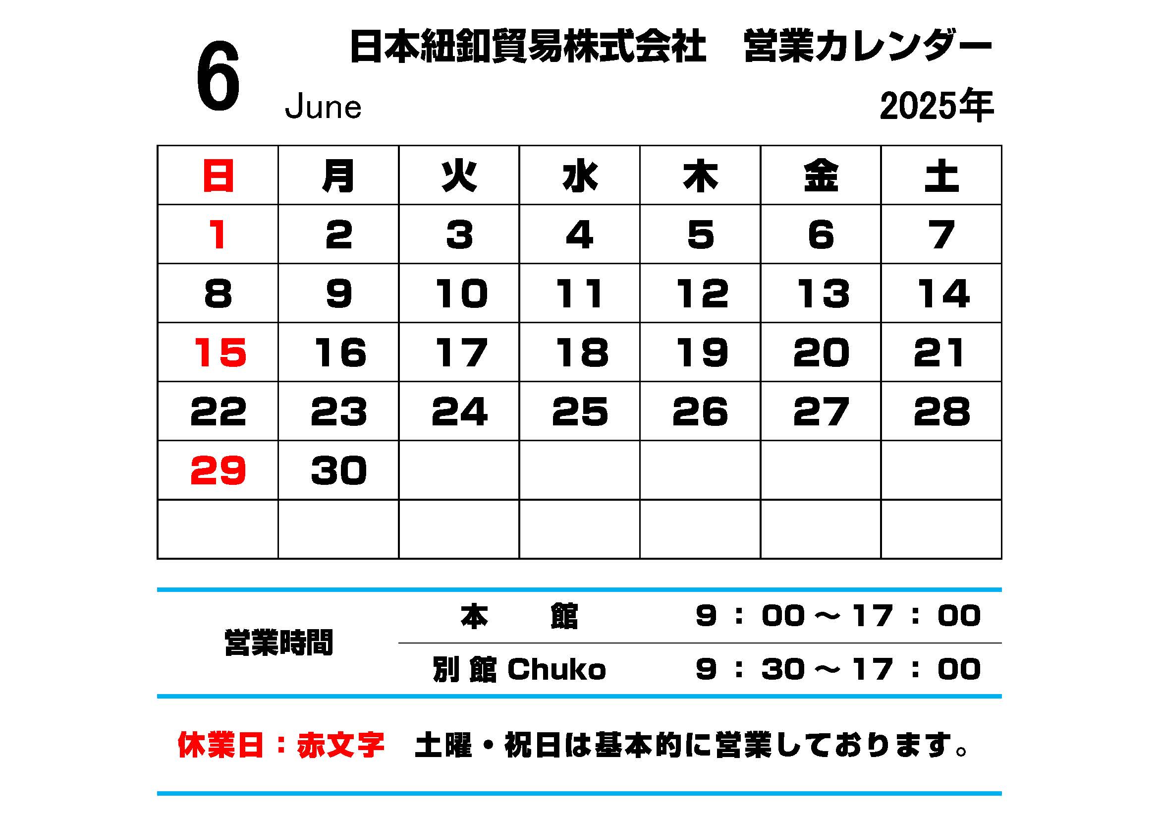 6月の営業スケジュールをお知らせします。