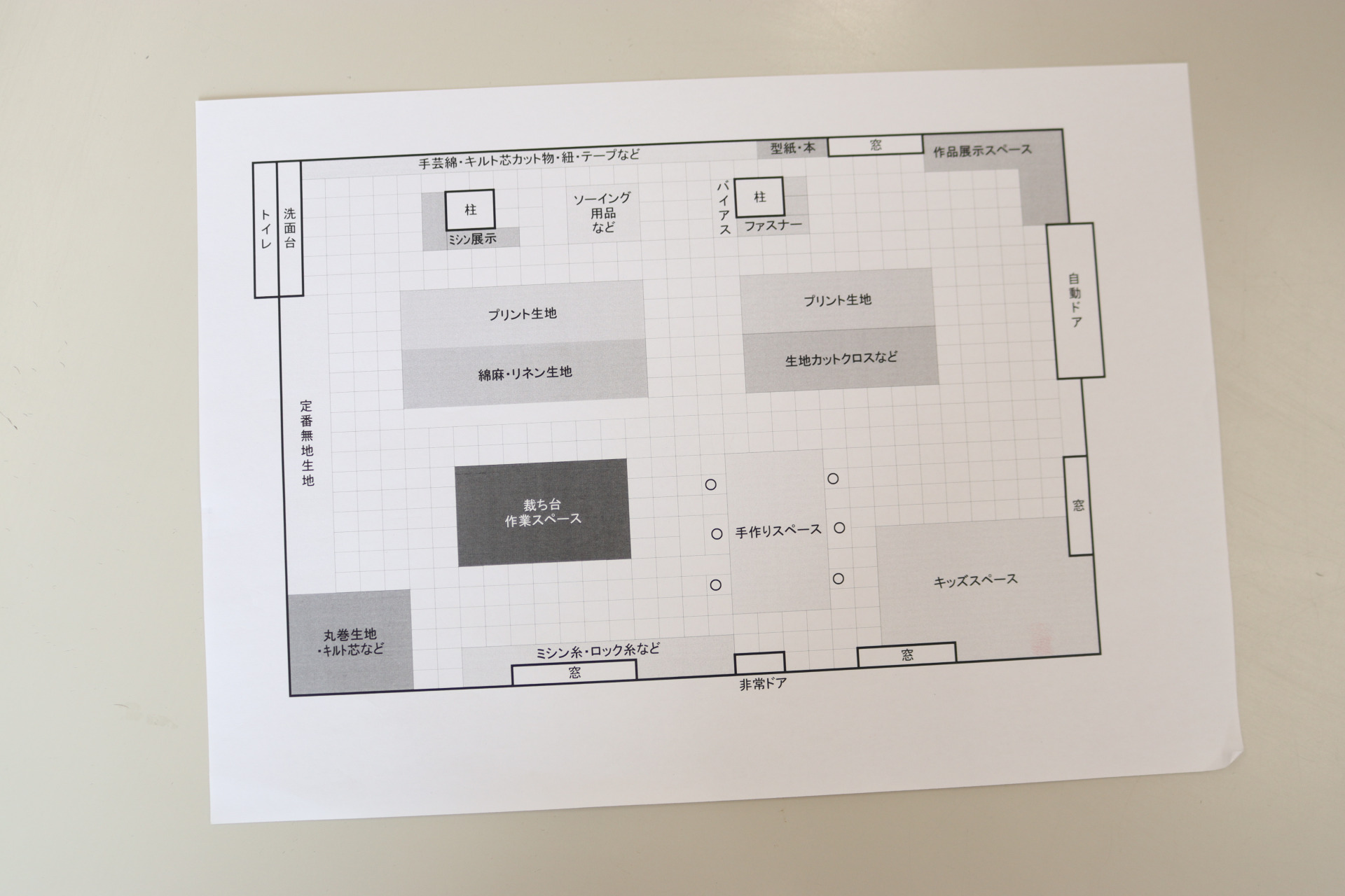中谷さん: 生地をメインに、子ども服や小物づくりのソーイング用品。ミシンの導入希望もあって、ミシンは当社からの提案も視野に。作品の展示スペースも作る前提です。がっつりした手芸フルラインではなく、生地中心に必要品を集約して展開するイメージです。