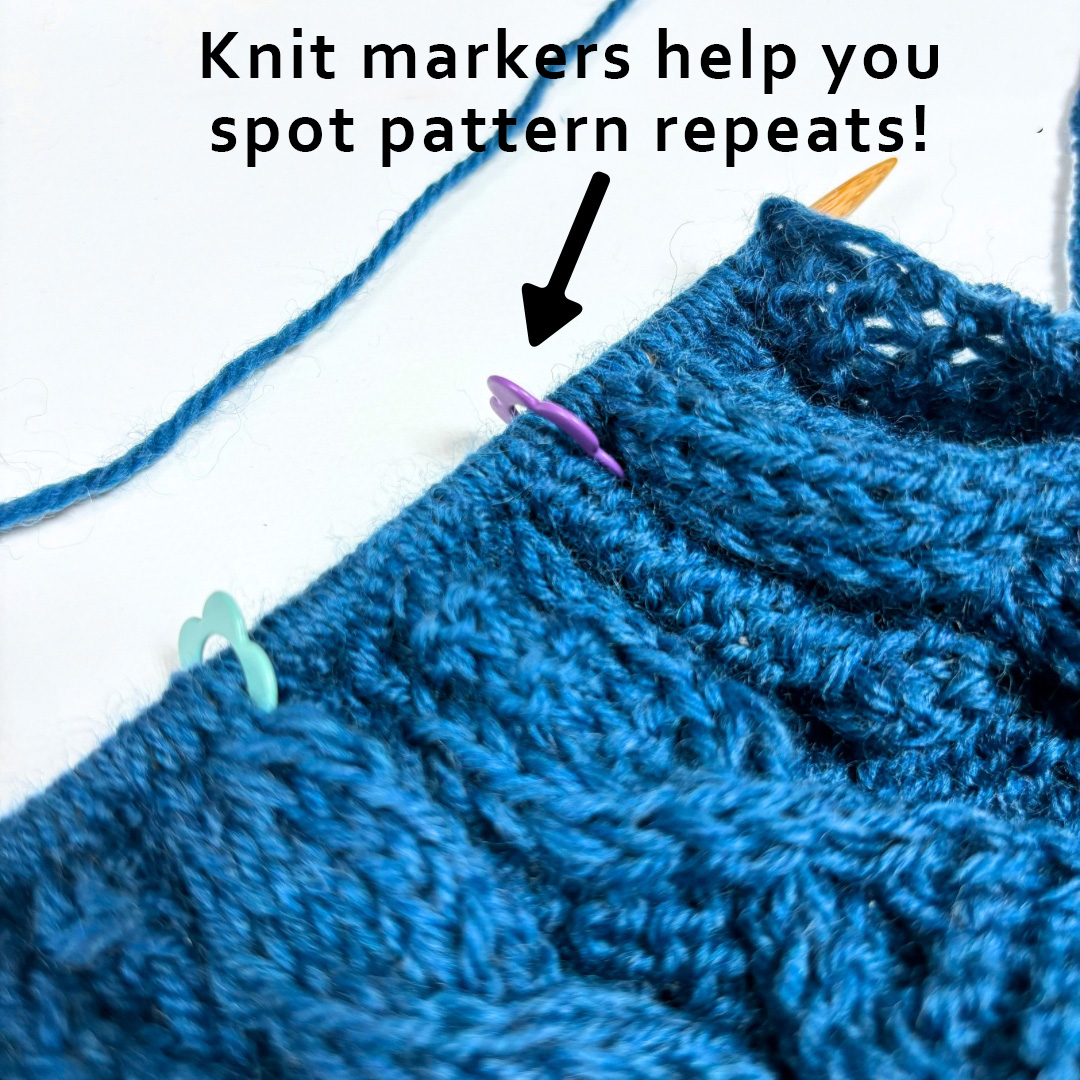 By using Numbered Stitch Markers, we can see roughly which row we’re on at a glance.