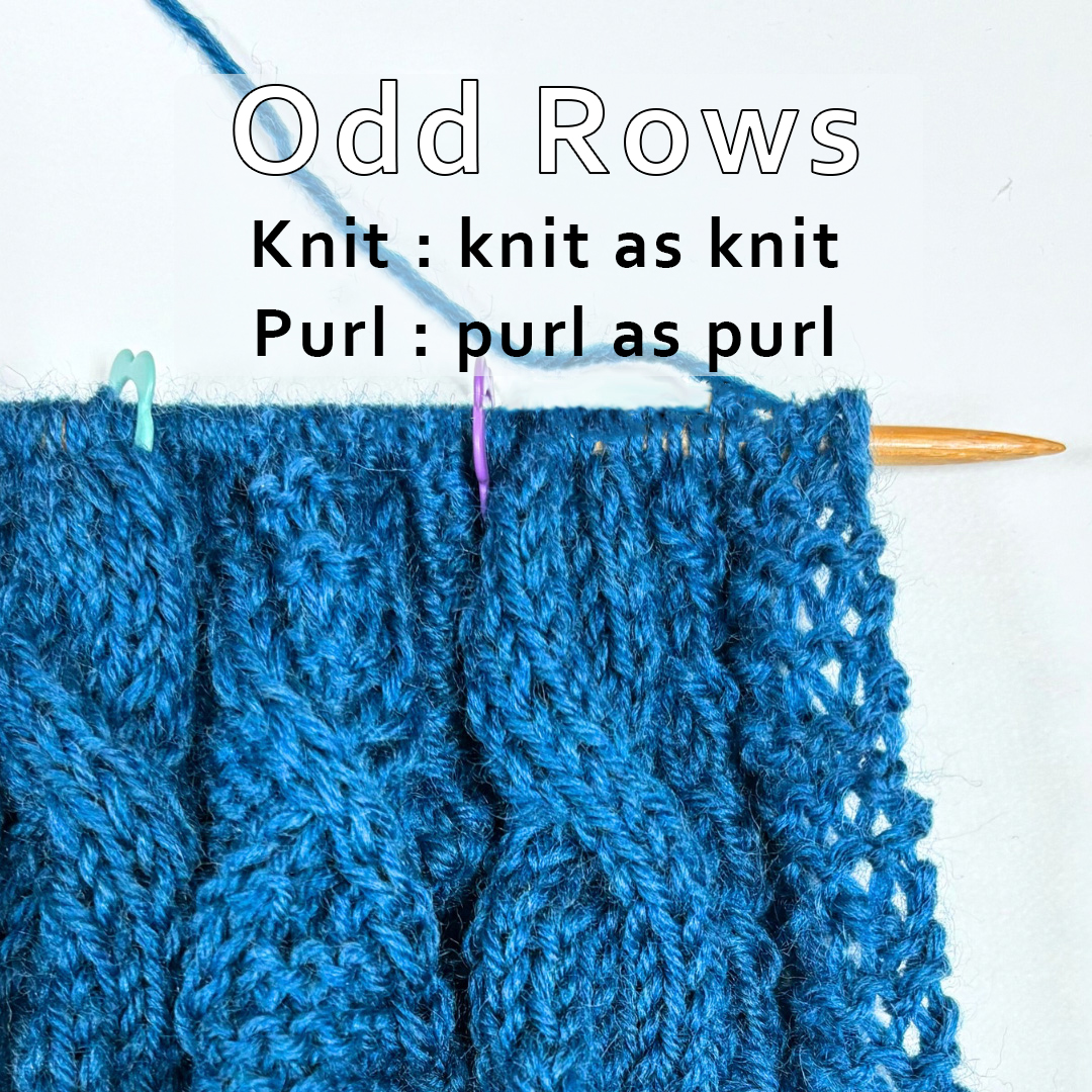 We follow the chart exactly: knit when it shows a knit stitch, and purl when it shows a purl stitch.