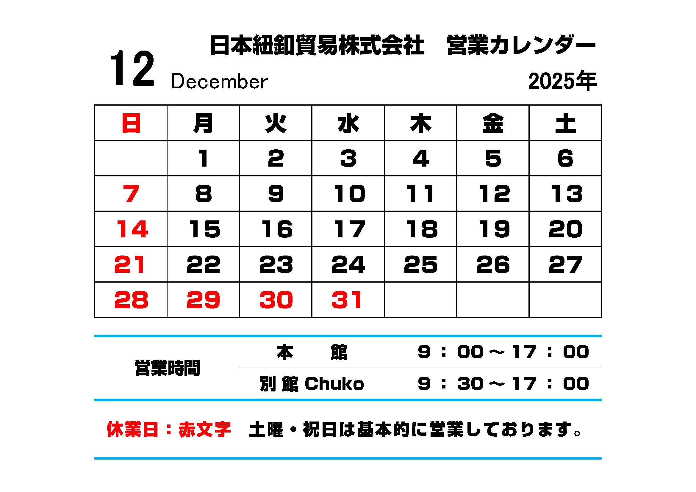 12月の営業スケジュールをお知らせします。