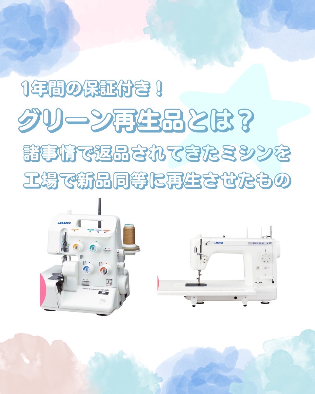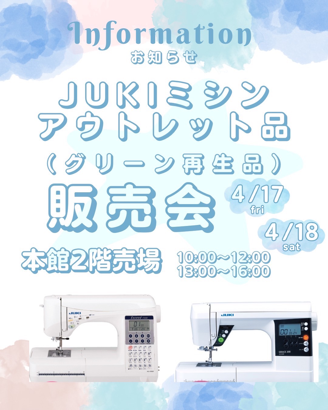 JUKIミシン販売員による、アウトレット品(グリーン再生品)販売会を開催いたします!