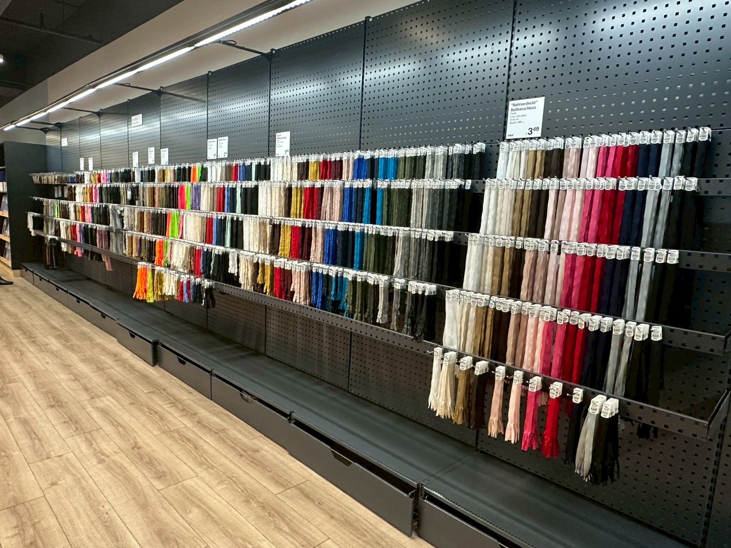 しかも生地だけを並べるのではなく、実際にカーテンとして仕立てた状態で吊り下げて見せているコーナーがあって、