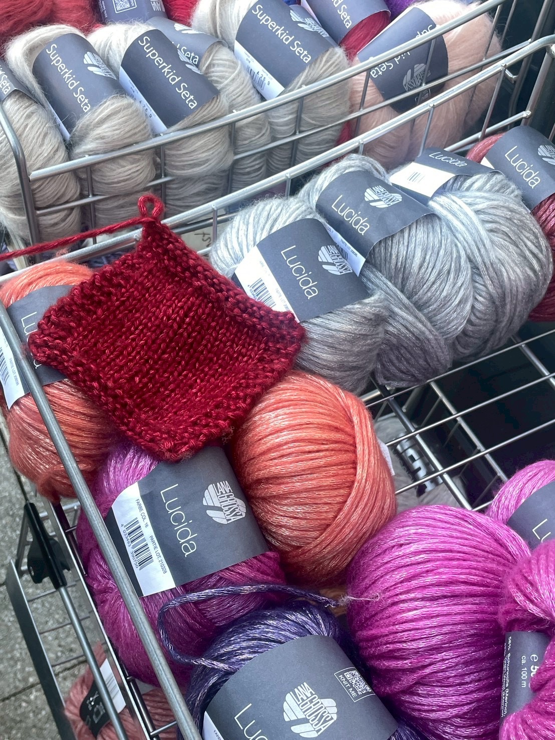 中に入ると、ひとつひとつの糸に編み見本がセットで置いてありました。これがすごくよくて。