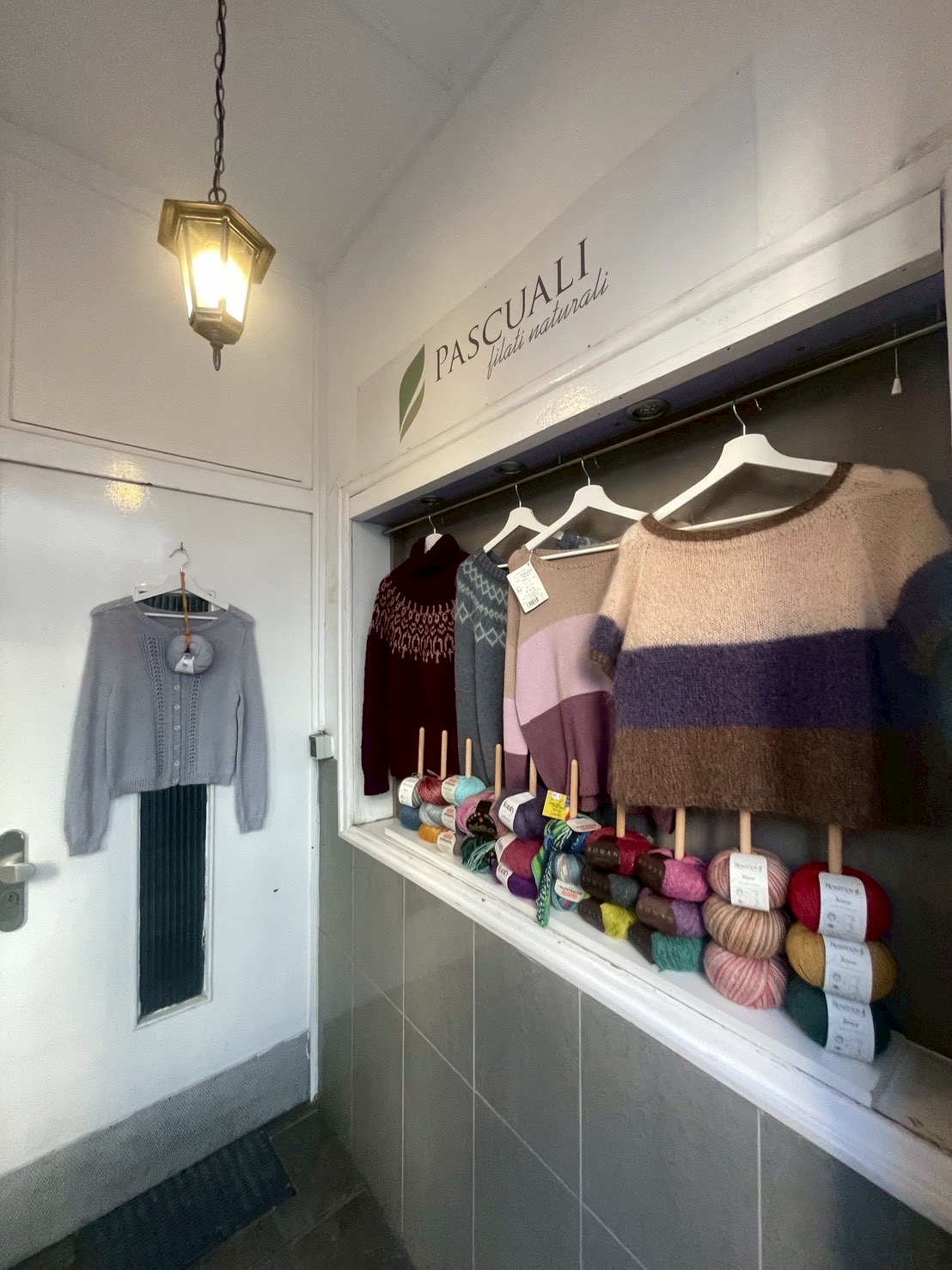 日本のお店だったら商品は全部中にしまっておくと思うのですが、ここは店の外にも糸がたくさん飾ってある。