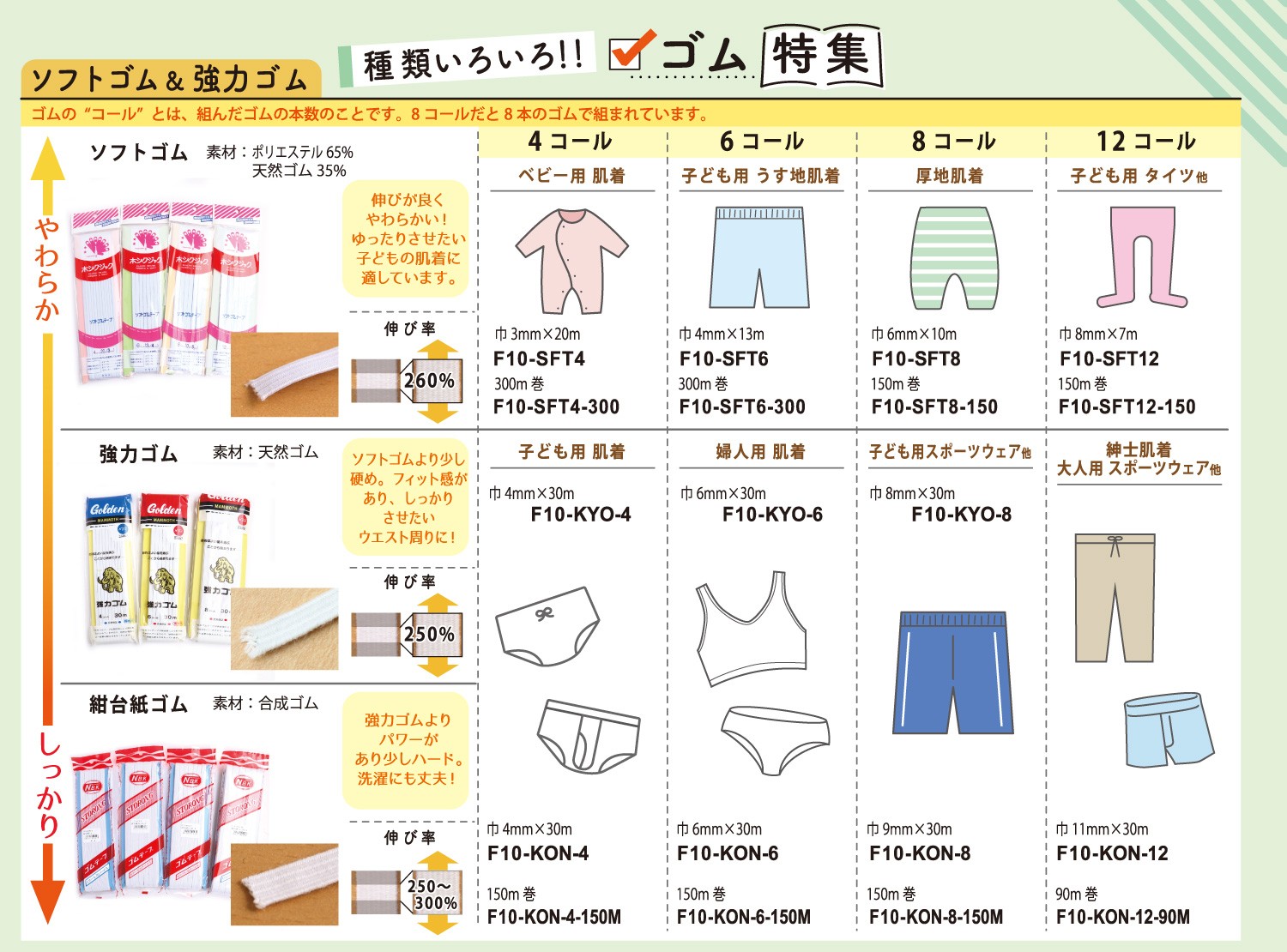 | 子ども服・ベビー服 | 平ゴム(ソフト・4~6コール) | やさしいフィット感 | 肌に優しい |