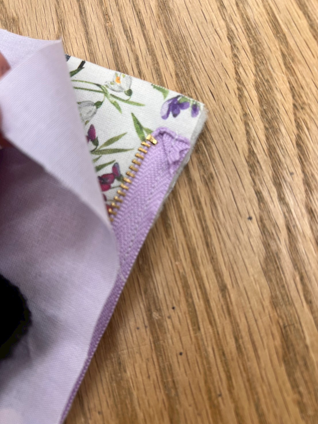 ポイント:ファスナー取り付け時、そのまま這わせるだけでも縫い付けられますが、ファスナーの生地の端を織り込んで縫い、固定しておくと仕上がりが綺麗になります