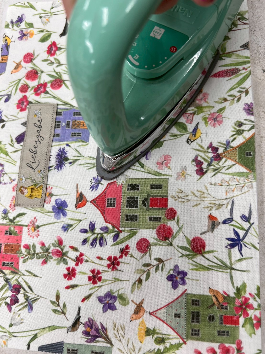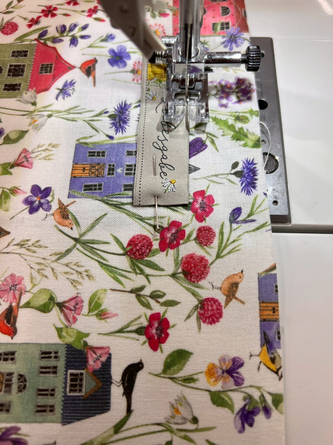 表生地の任意の場所にラベルをセットし、ラベルの端から1㎜ほど内側をミシンで縫い付ける。