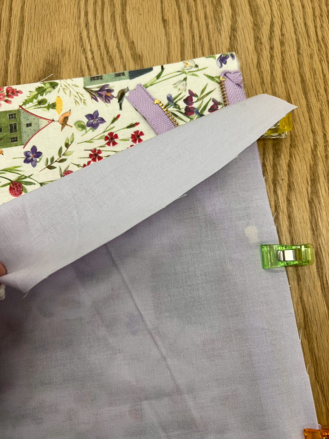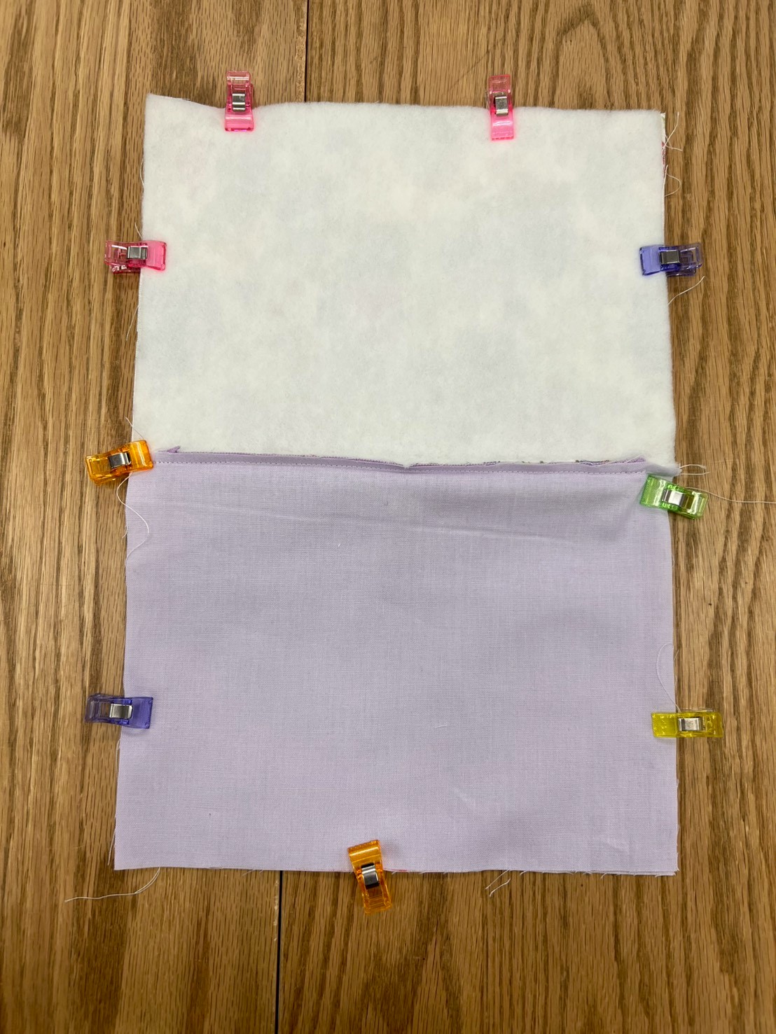 表生地どうし・裏生地どうしをそれぞれ中表になるように合わせクリップで止める。