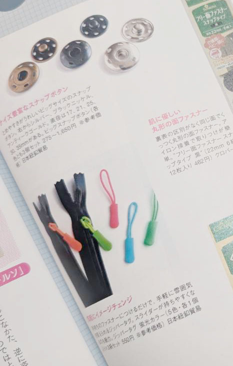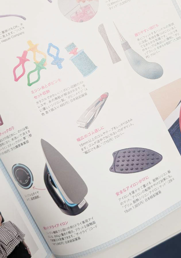 『誌上・パターン塾 特別編 シニア原型で服作りが変わる!』に、ソーイングの便利グッズとして、日本紐釦貿易のボビンメイツ(NI-04423)、耐熱アイロンシリコンマット(PRM611911)、ドライアイロン(J78D)、ジッパータグ(KE2010-MIX)、ビッグスナップボタン(ISZ-サイズ)をご紹介いただきました。