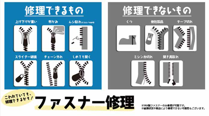 修理対象: YKK製ファスナーに限ります。ファスナーの破損状況により、リペア対応が出来ない場合もございます。