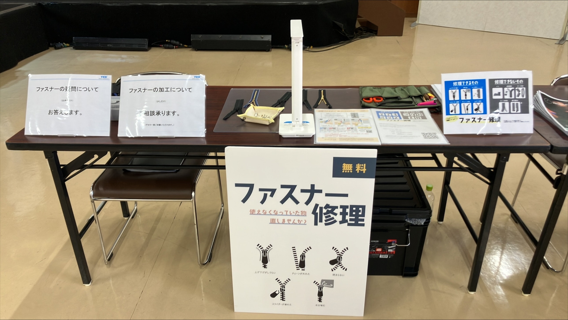 ファスナーに関するお困りごとは、このブースで解決!修理が必要なYKK製のファスナーがあれば、事前予約制で無料でファスナーのリペアサービスを提供します。