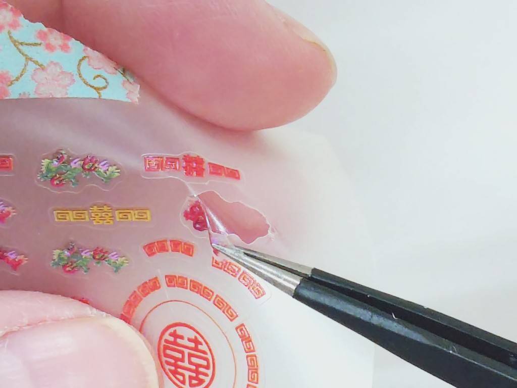 先端が細いピンセットは、狙った位置に正確に配置できますが、このピンセットは特に硬化前の封入パーツ(ラメ・パーツ・シェル)の配置やレジンシールをはがす作業など細かい繊細な作業に最適です。