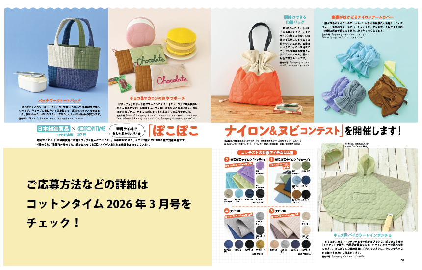 『COTTON TIME/コットンタイム』2026年3月号にて、御誌コットンタイムと弊社日本紐釦貿易のコラボコンテストが開催されます。開催に伴いまして、参考作品用にぽこぽこナイロン生地Doty-ドッティ-(DOT210)とCUBE-キューブ-(KYU210)、ヌビ(NBY307/NBY303)を資材提供いたしました。