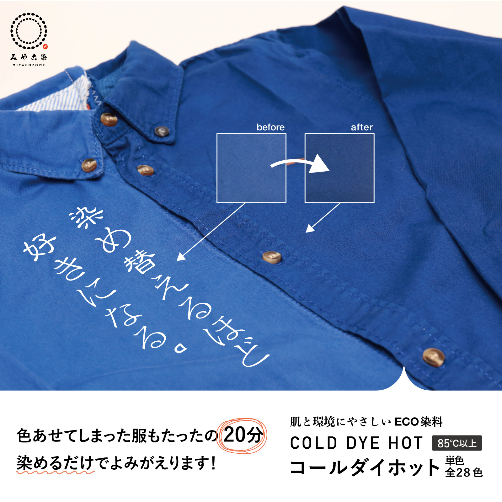 This is a set of ECO dye that dyes deeply with hot water (over 85℃) and a color fixing agent that is used after dyeing cotton linen rayon.