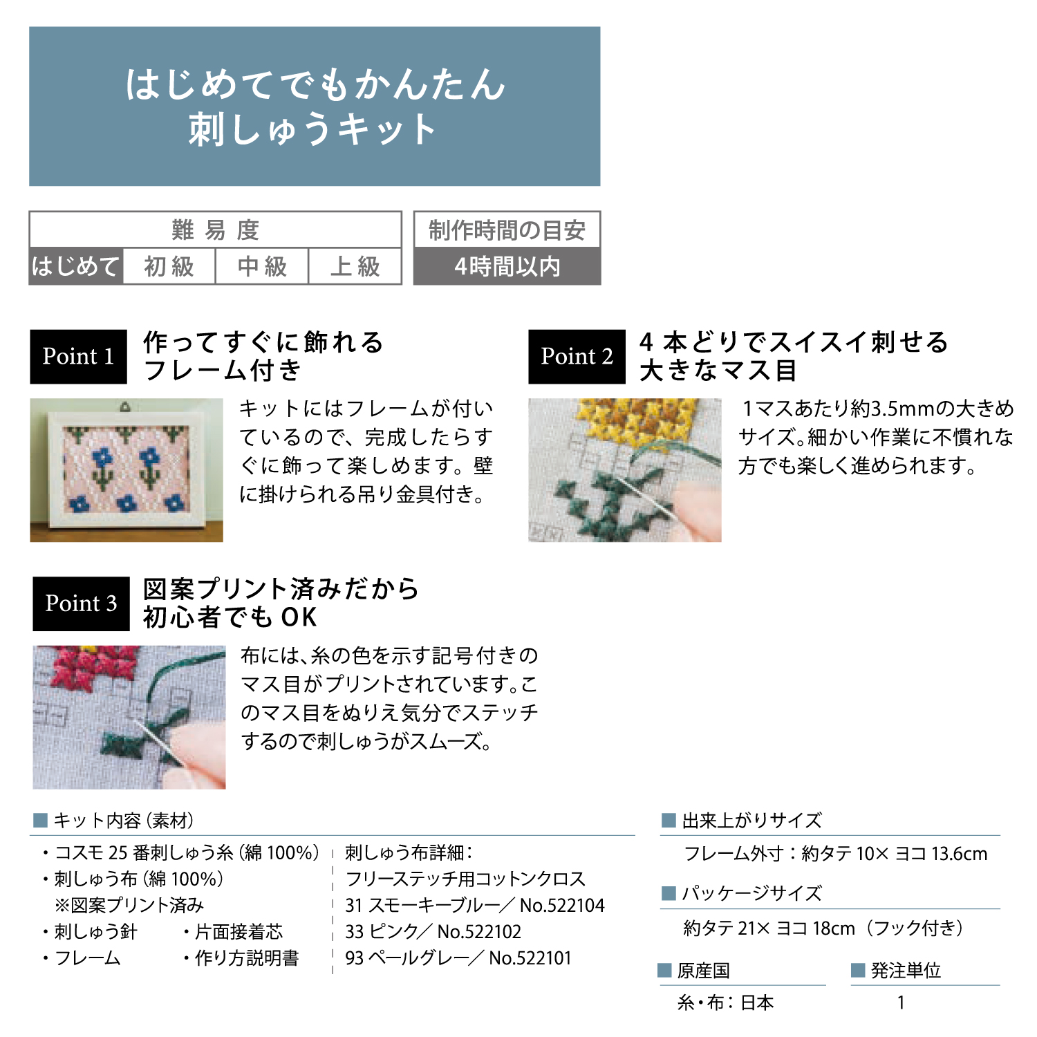 ■キット内容:25番刺しゅう糸、刺しゅう布、刺しゅう針、フレーム