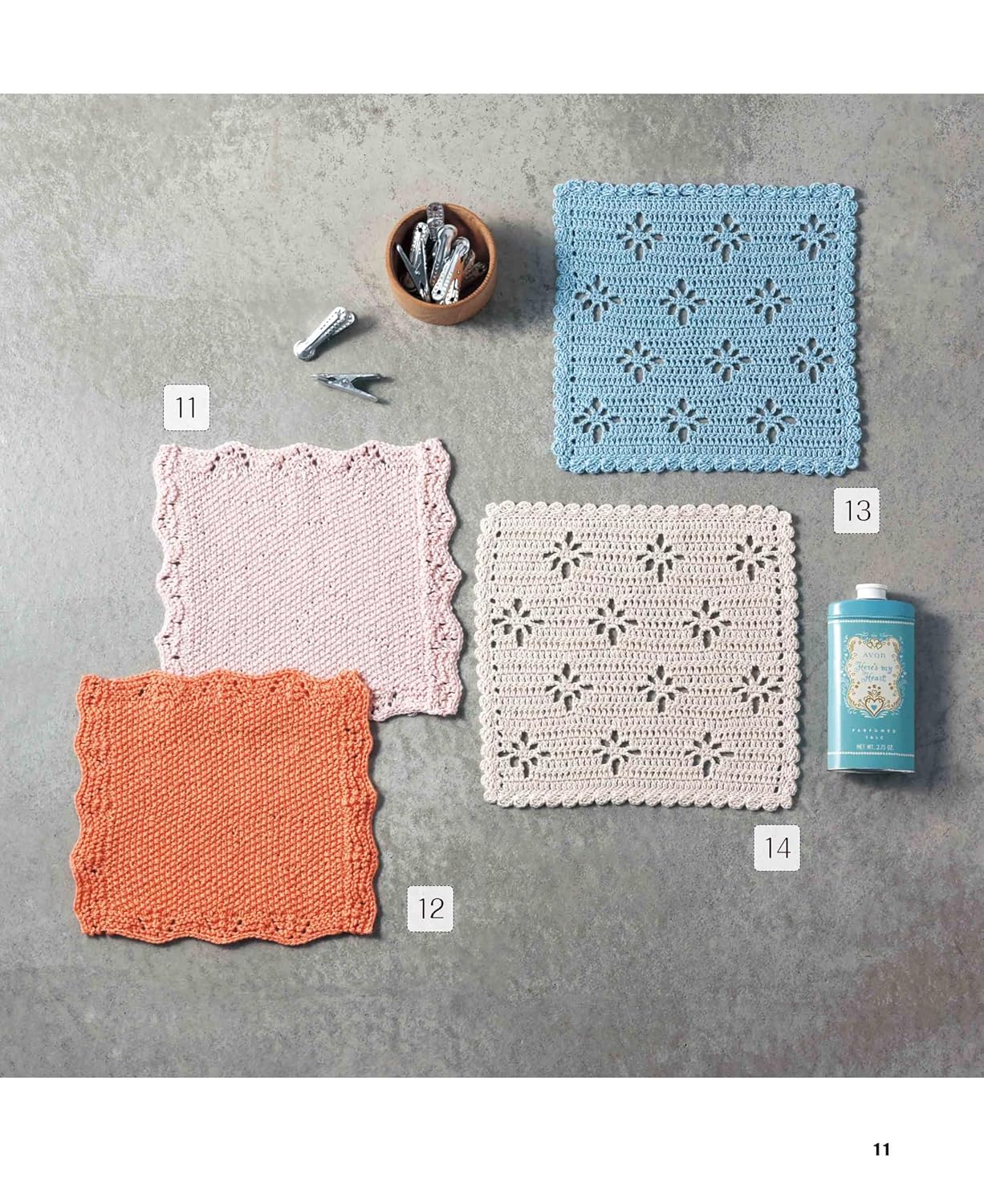 All works are made with cotton thread, which is soft to the touch and can be washed and reused, and includes stick-knit and crochet works.