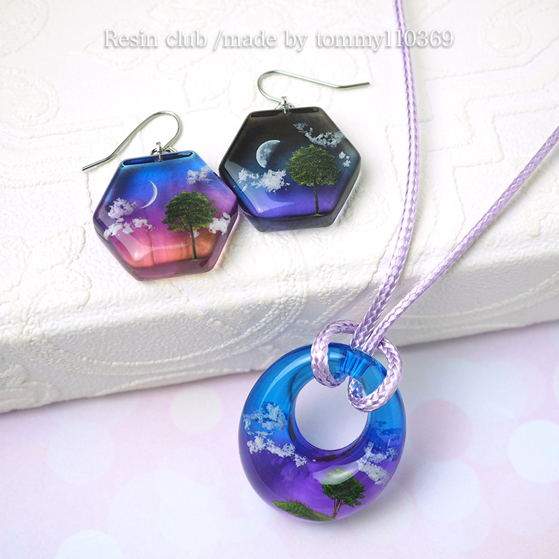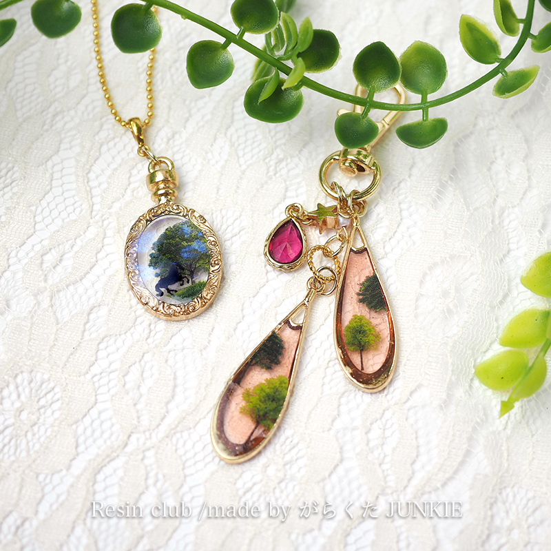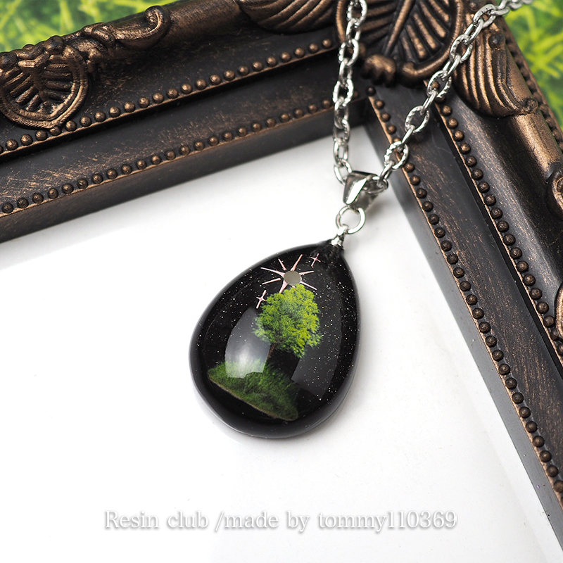 A small piece of greenery is trapped inside the resin. Delicate tree motifs overlap to create a worldview that gives you a sense of depth and story.