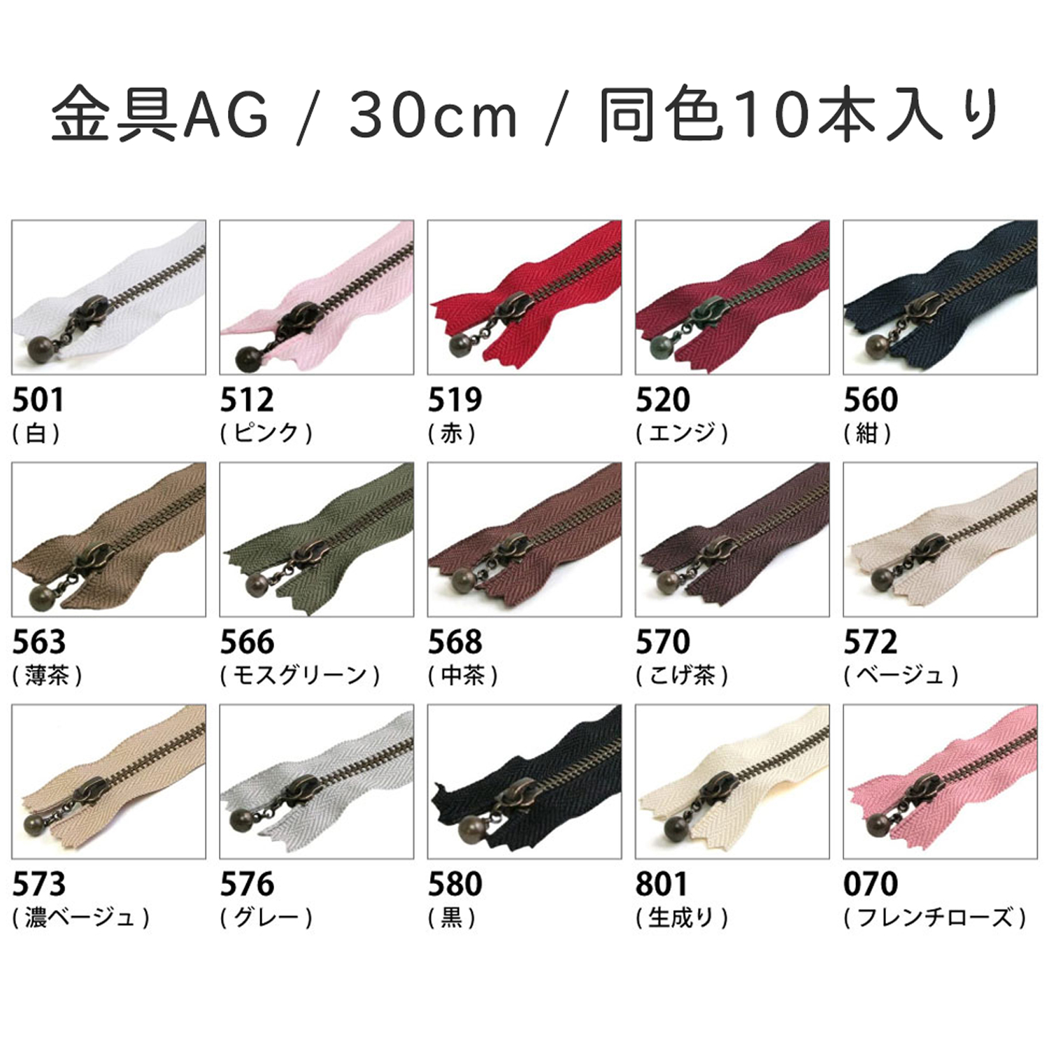 3GKB30-OVER200 玉付ファスナーAG 30cm 同色10本入 色取り合わせ20袋以上で特価 (袋)
