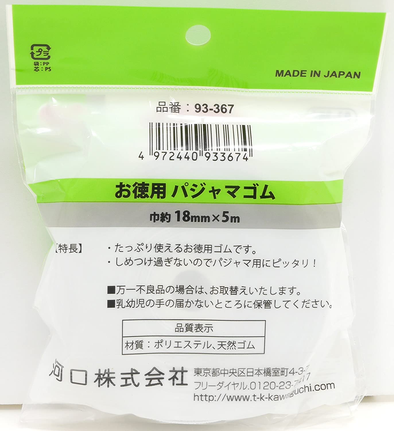 【無くなり次第廃番】TK93367 KAWAGUCHI お徳用 パジャマゴム 幅18mm 長さ5m巻 白 (個)
