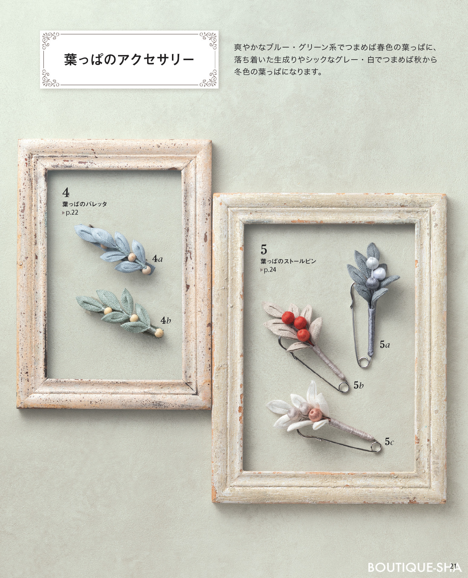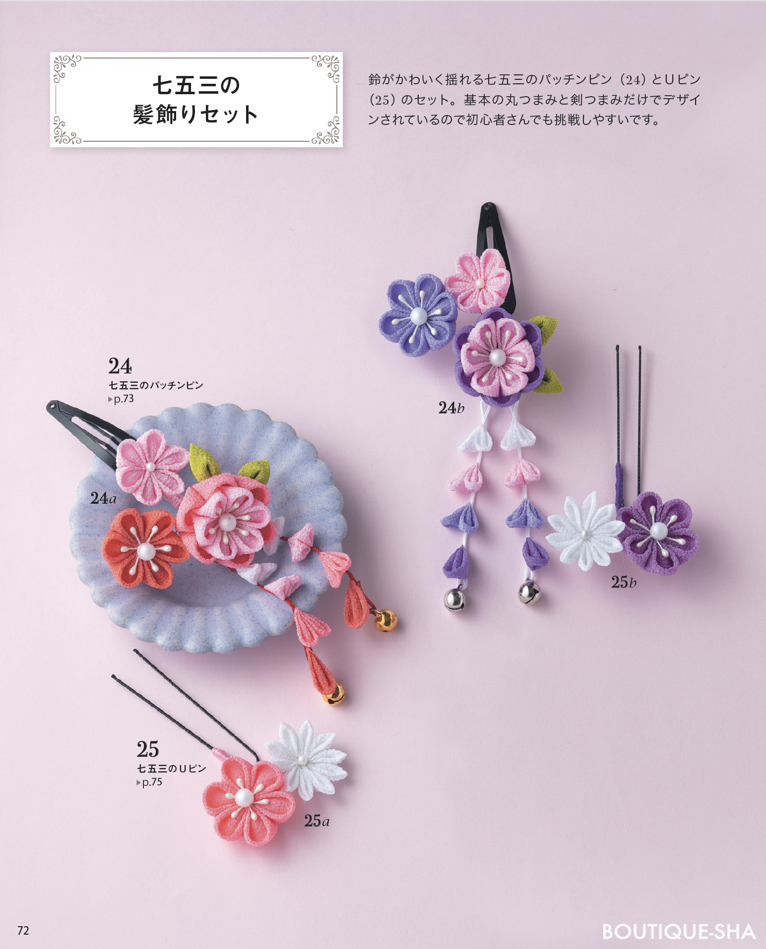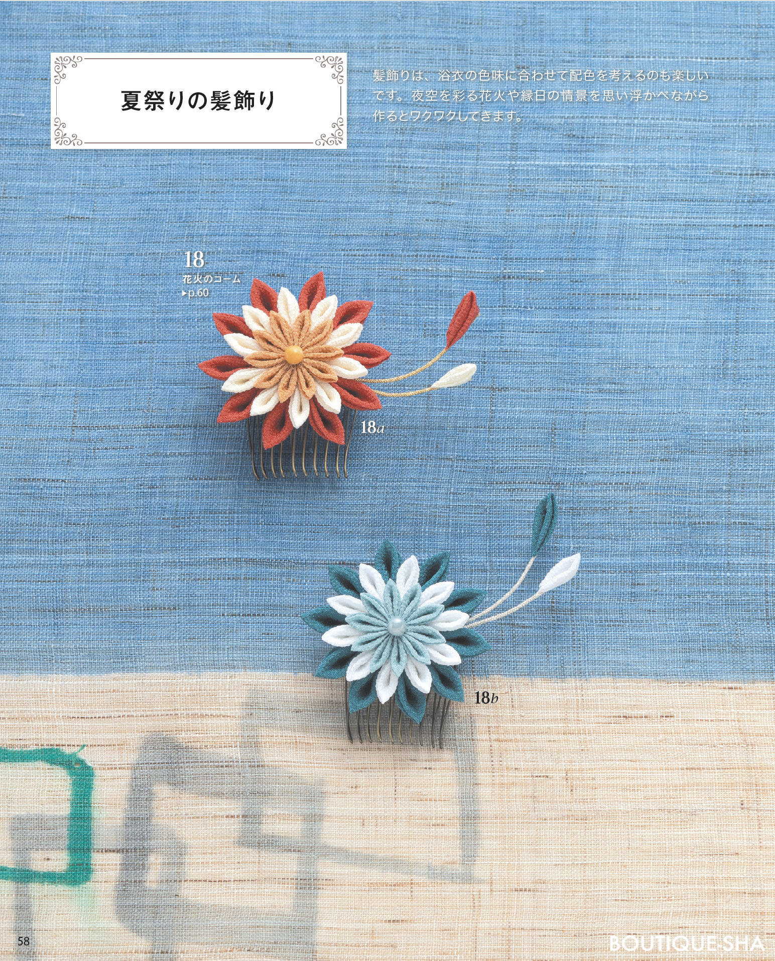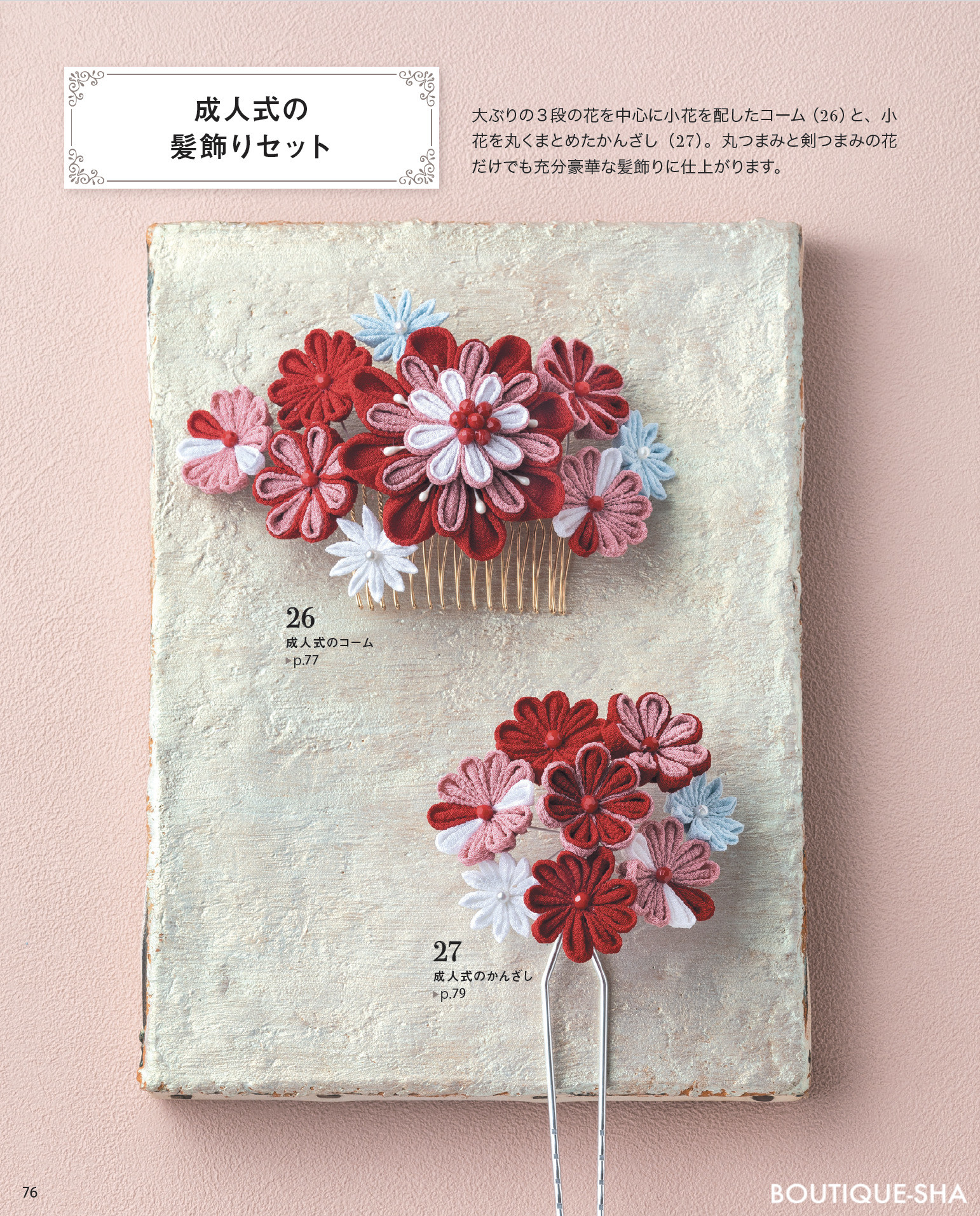 チューリップやバラ、朝顔、あじさい、コスモス、ポインセチアなど、色とりどりの花をモチーフに、普段使いできるヘアアクセサリーやブローチの他、七五三、成人式用の本格的な髪飾りまで、さまざまな作品を紹介。作り方はすべて写真解説。ちりめんやコットン、リネンなど入手しやすい布地と木工用ボンドで作るので、はじめての方でも気軽に始められる。