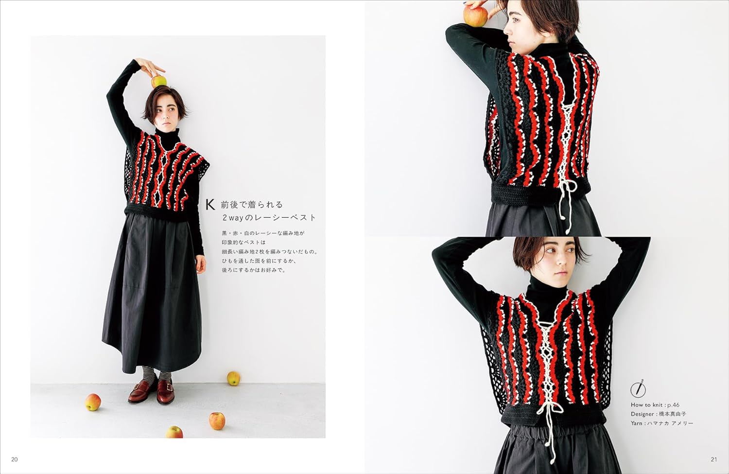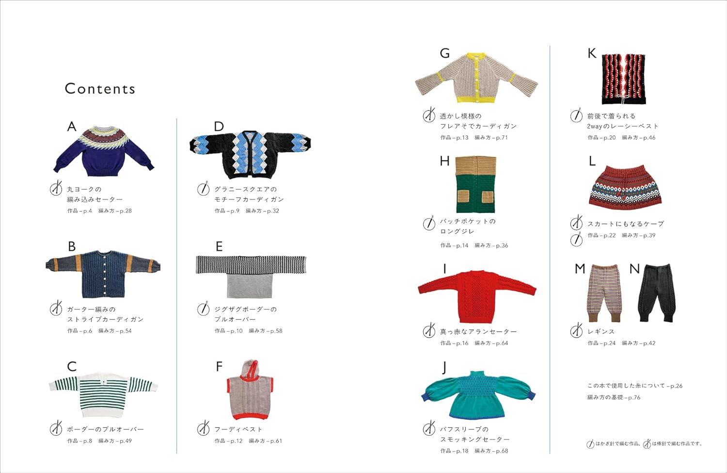 かぎ針編みの作品と、棒針編みの作品の両方を掲載。わかりやすいようにマークをつけてあります。