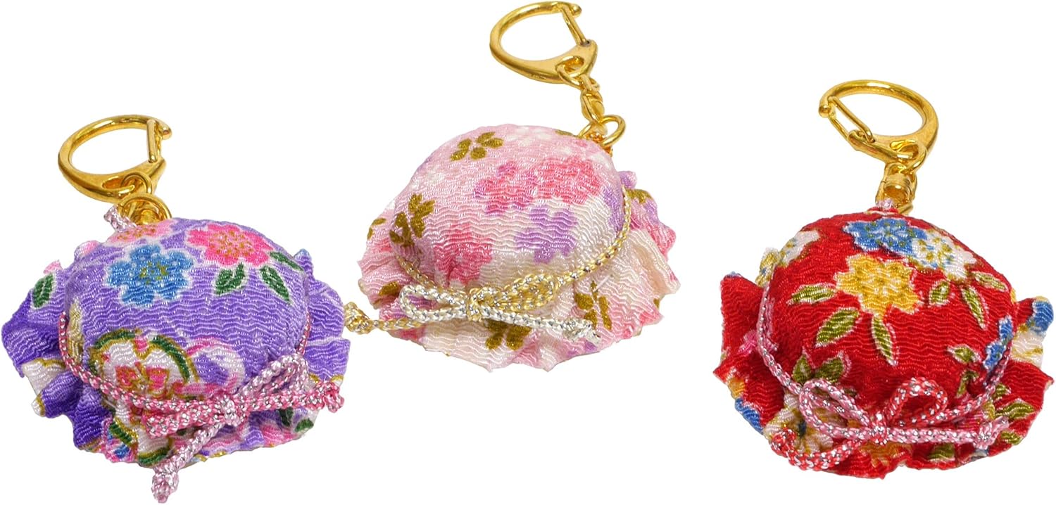ちりめん生地(無地・柄)、メタリックヤーン、キーホルダー金具、綿