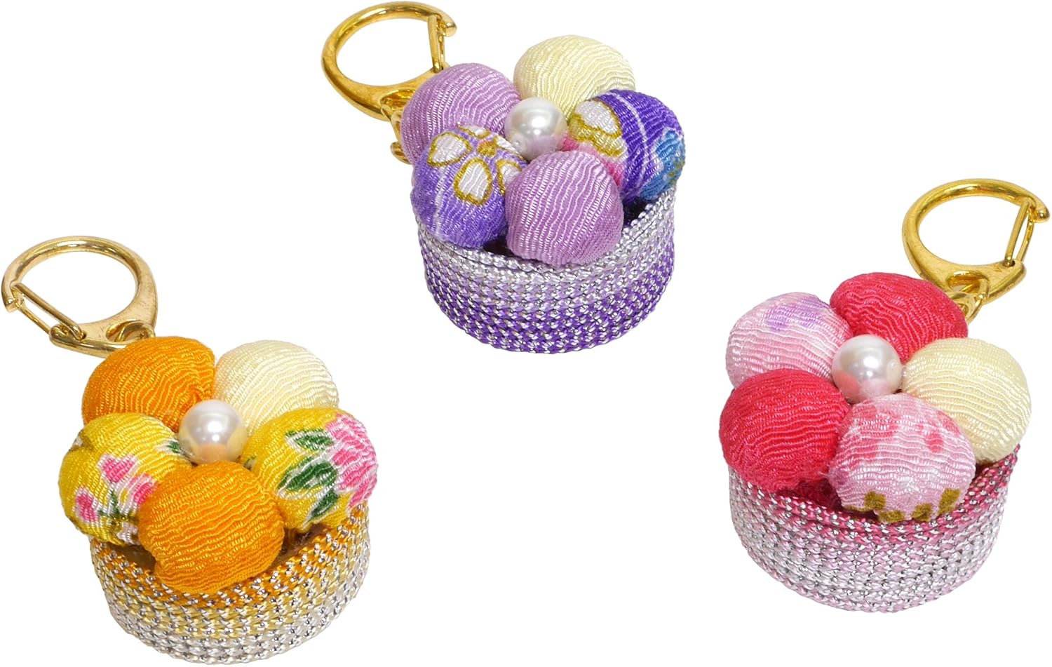 ちりめん生地(無地・柄)、メタリックヤーン、パール、キーホルダー金具、綿
