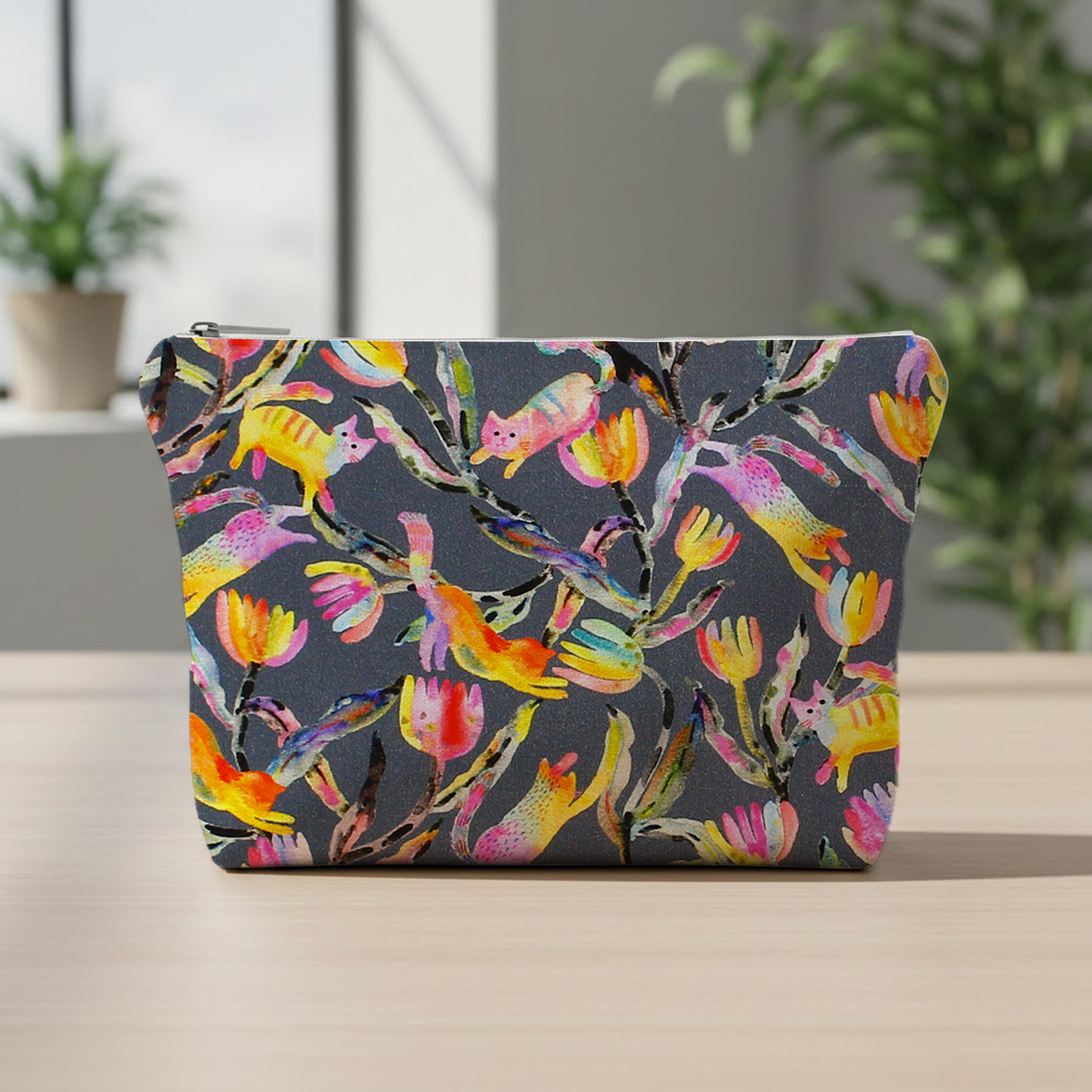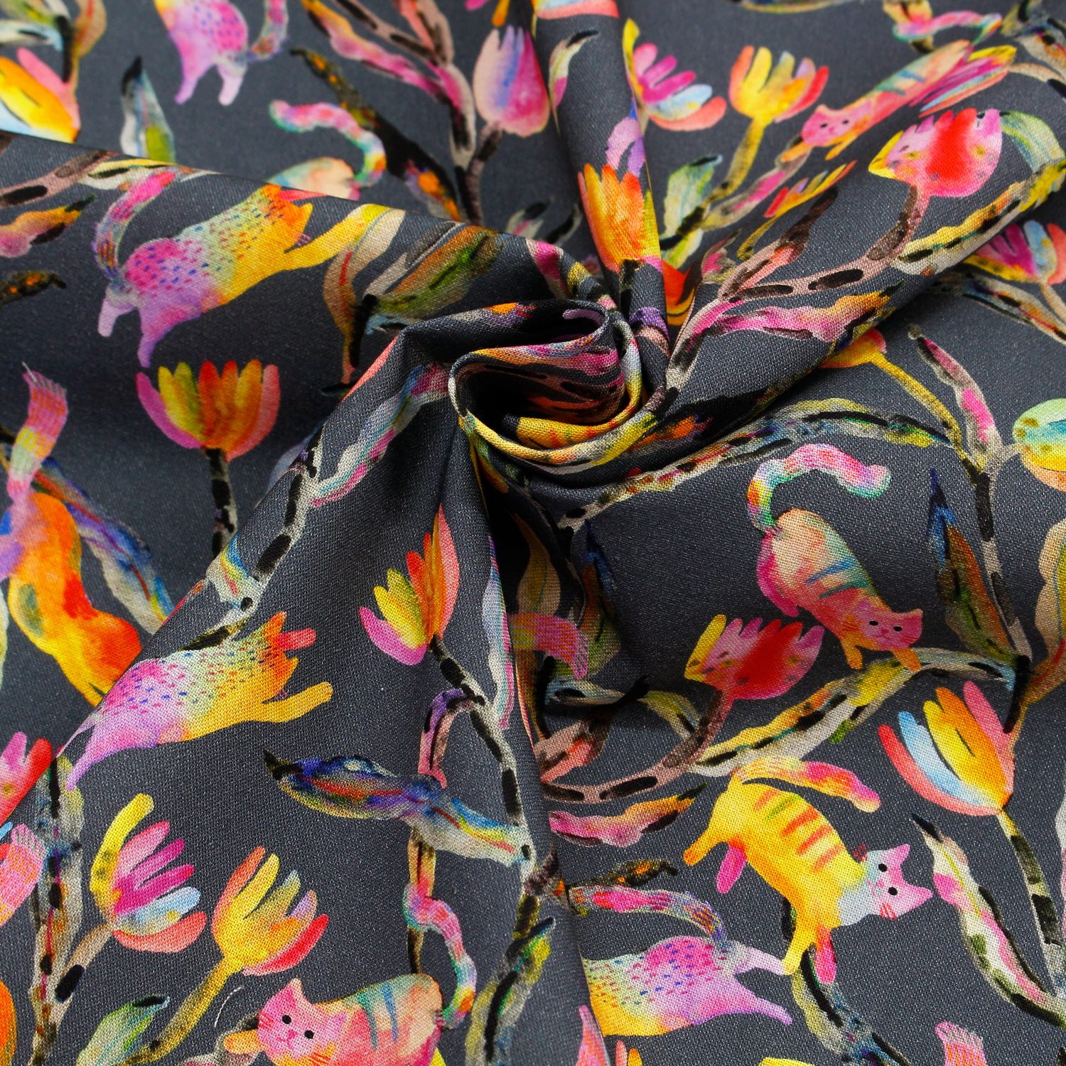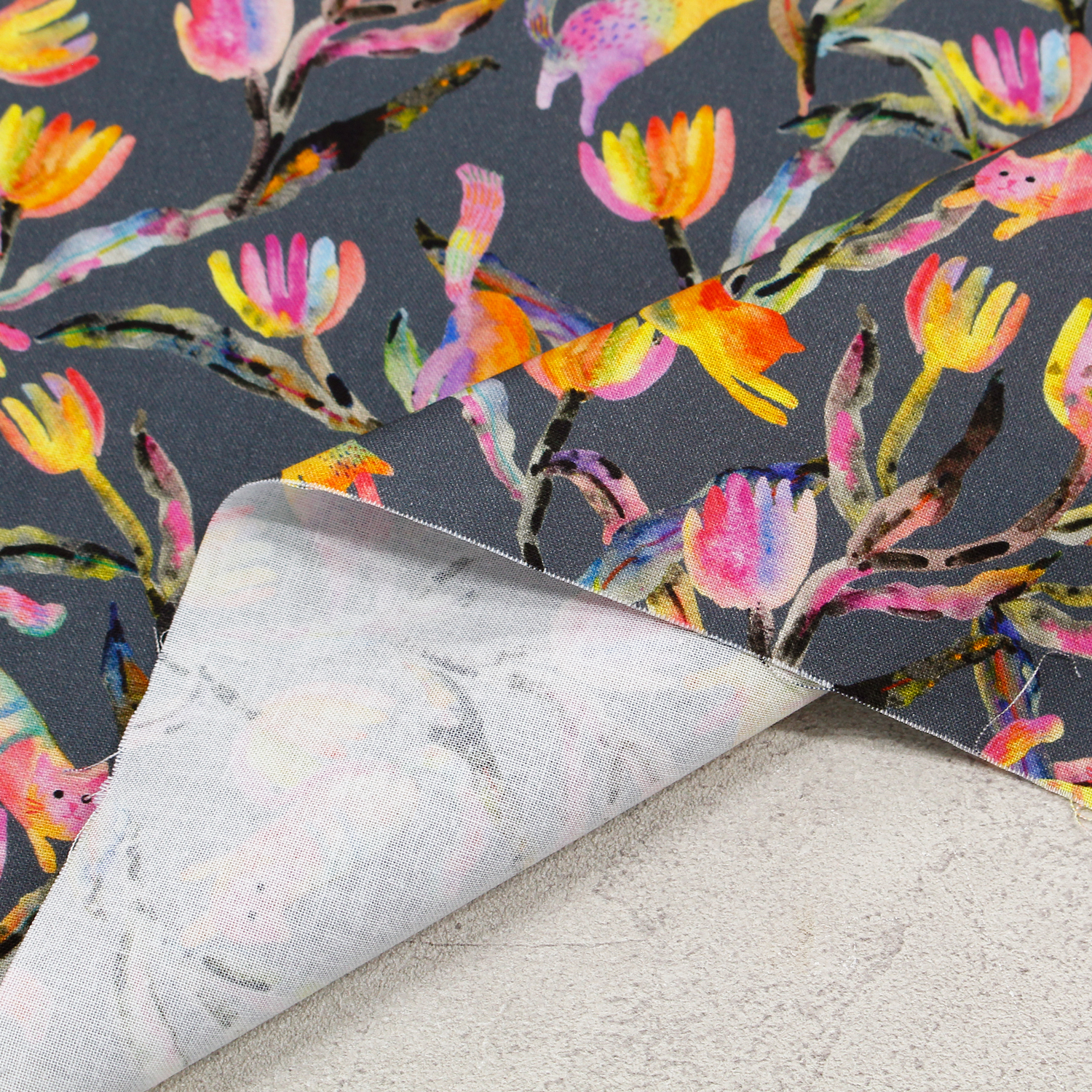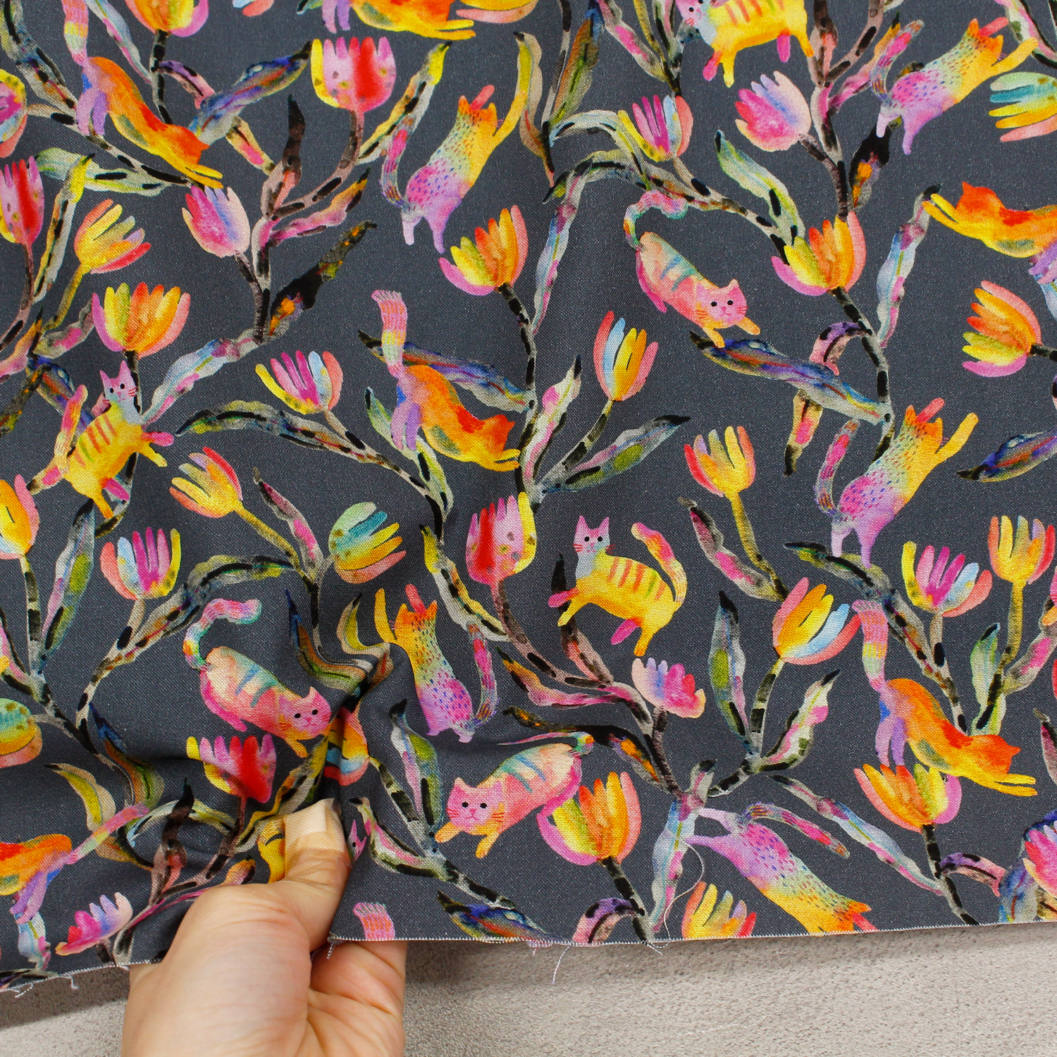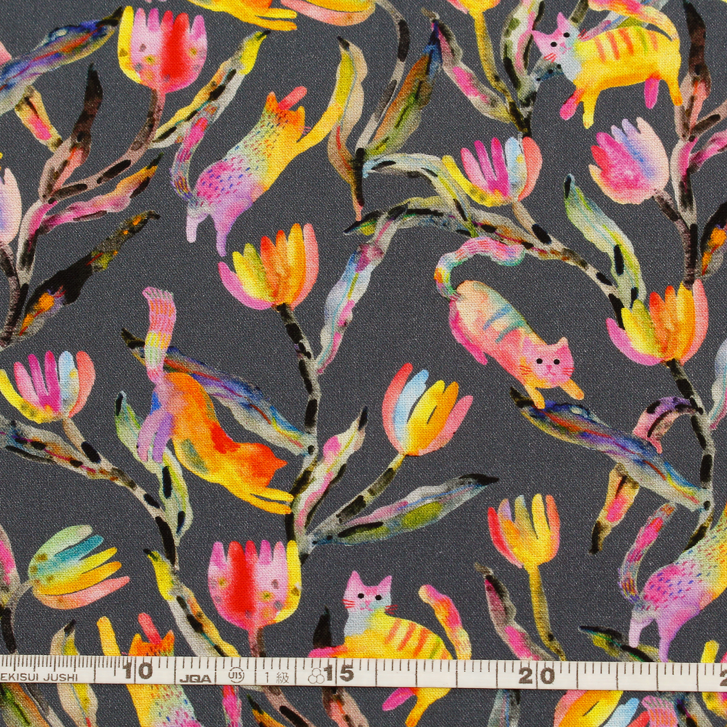 【0116新柄】ROB23287-304 グレー地 カラフル植物とネコ ROBERT KAUFMAN ロバートカフマン USAプリント 巾約110cm 1m単位 (m)