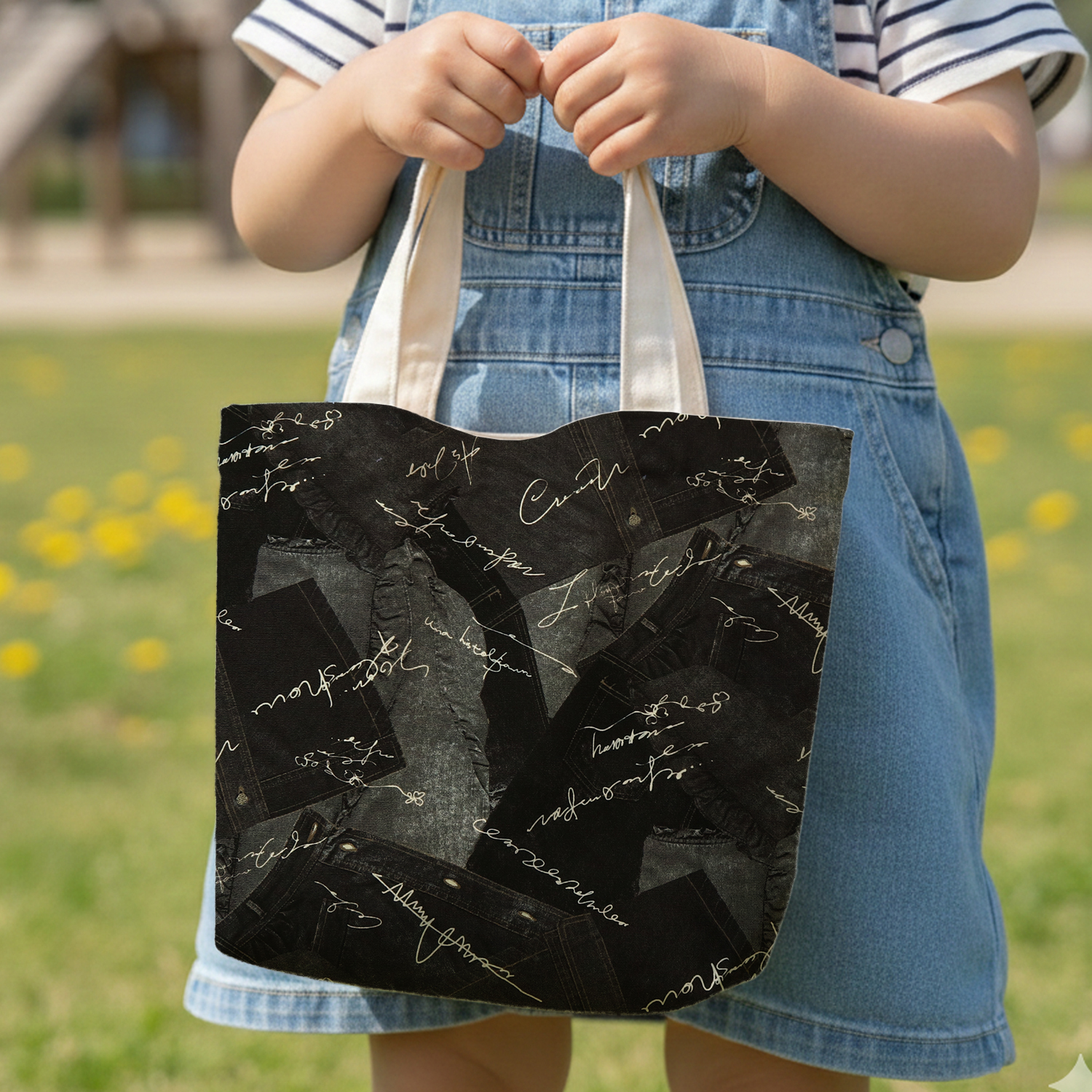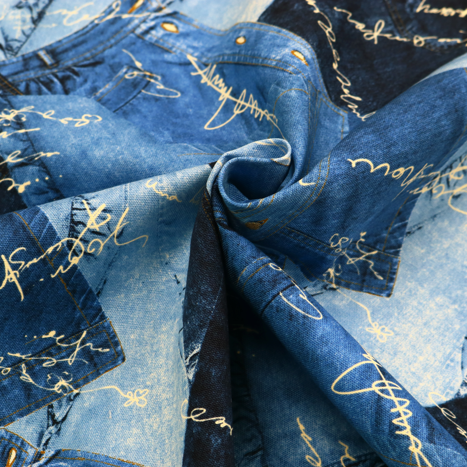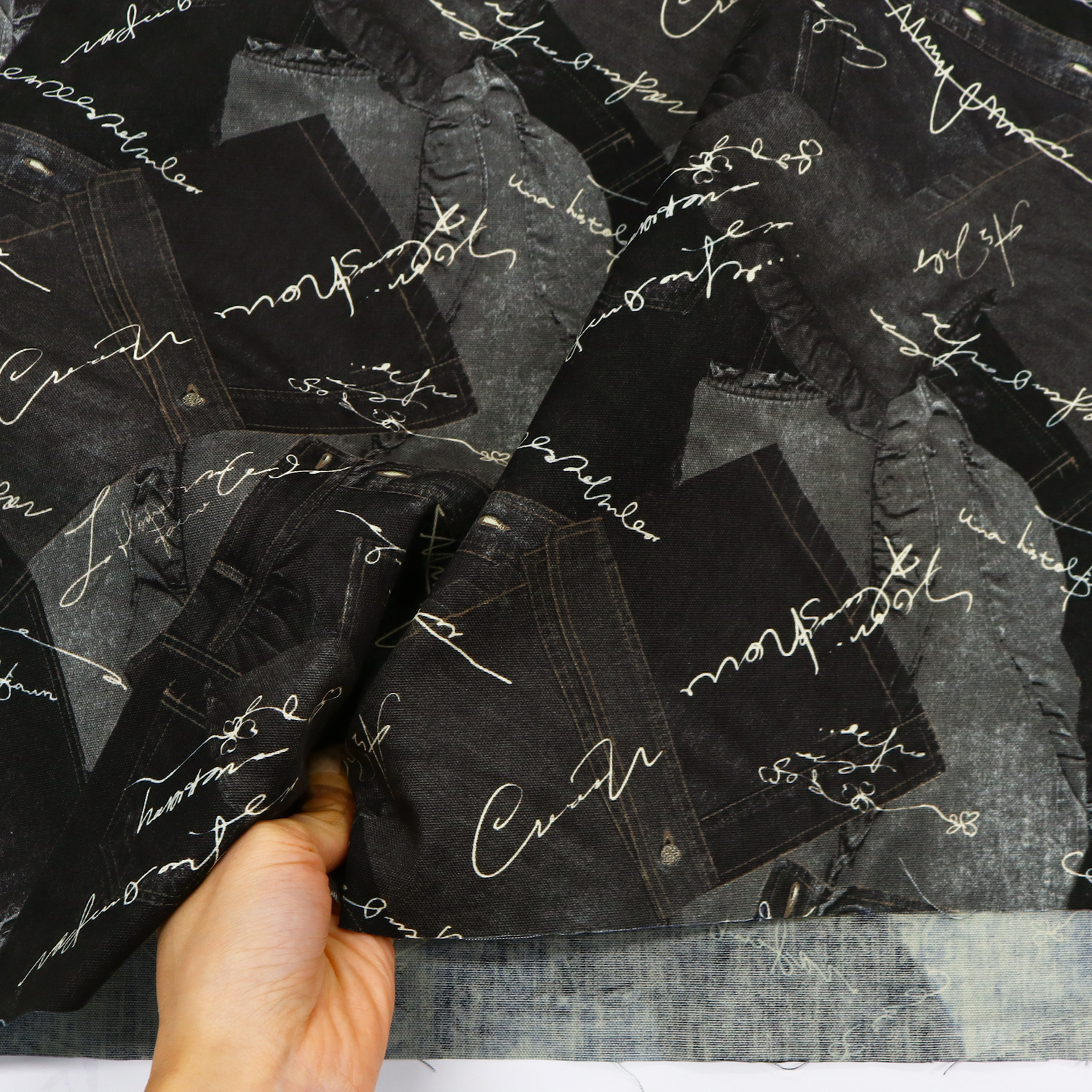 リアルなデニムがコラージュ風にプリントされた生地で、バッグやポーチなどの作品作りにおすすめです