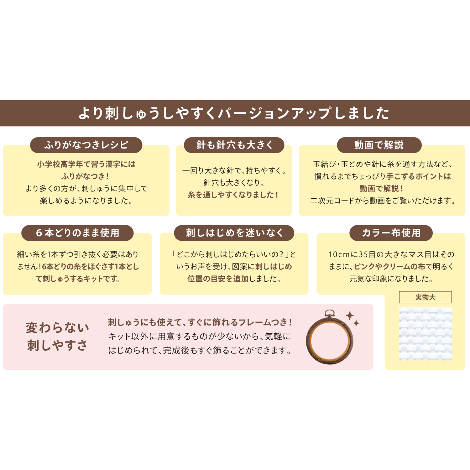 ■キット内容/刺しゅう布(1cm=3.5目・綿100%)、25番刺しゅう糸(綿100%)、フレーム(内寸:約7.5cm スチロール樹脂・塩化ビニール)、刺しゅう針(鋼)、図案入り作り方説明書お子様やご年配の方にもクロスステッチが簡単にできる「1DAY」キット。