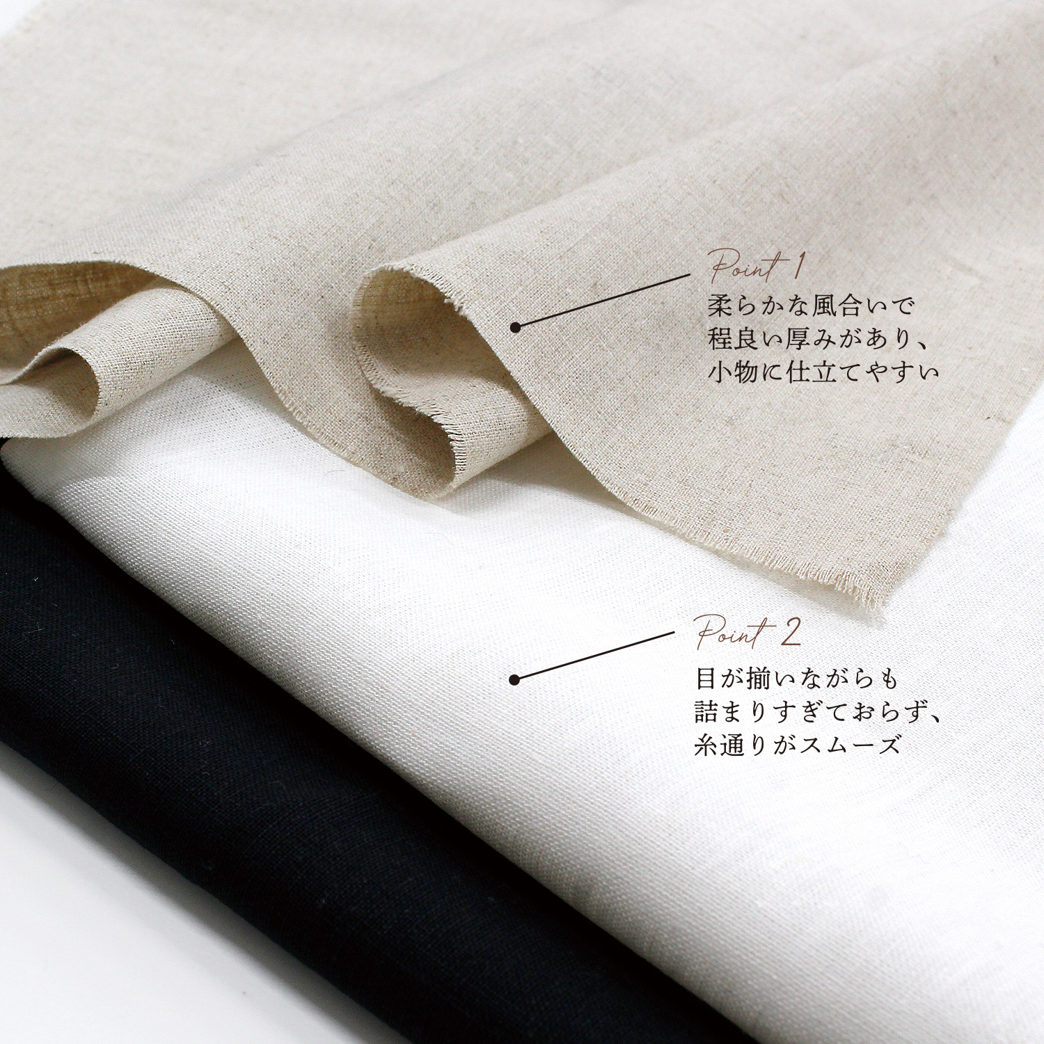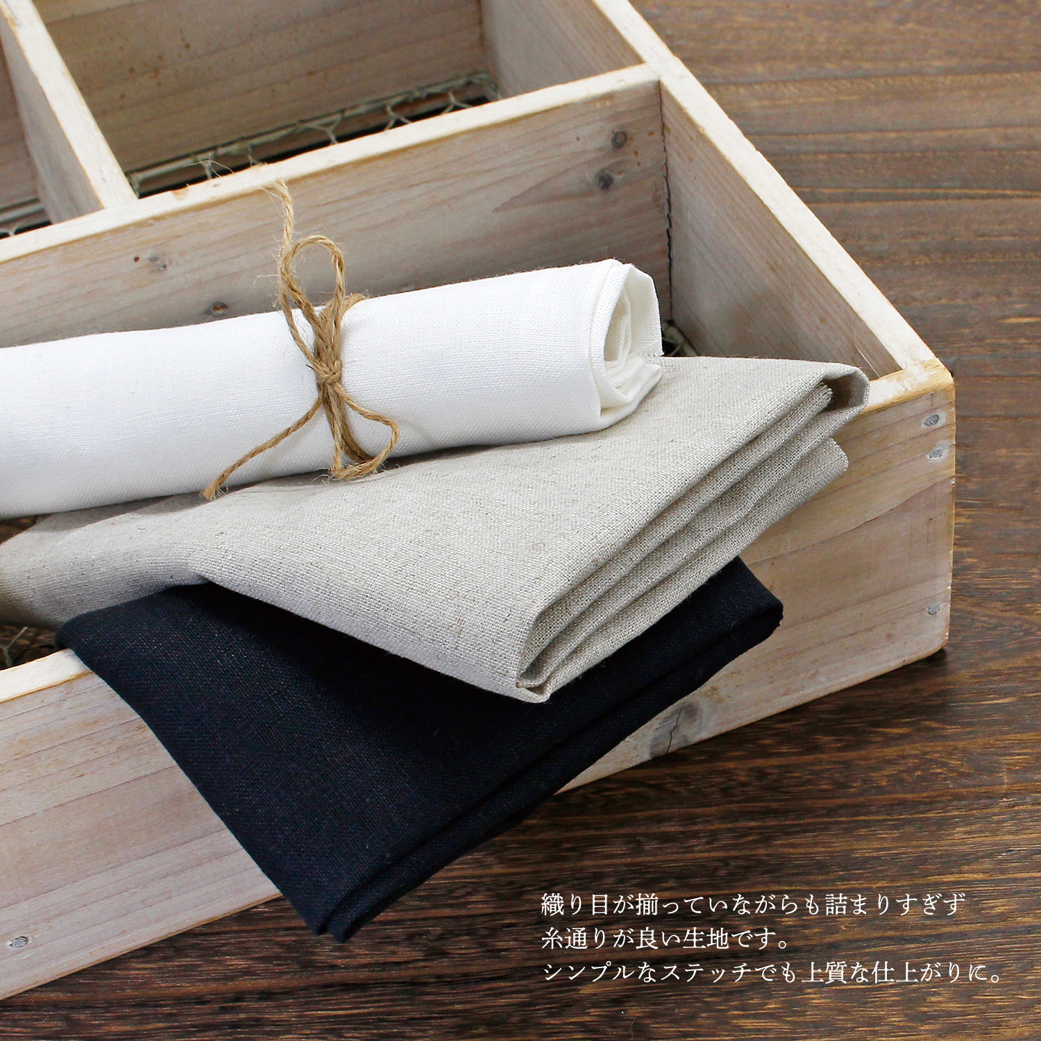 織りがきれいで刺しやすく、ナチュラルリネンならではの色味と高級感が魅力です。
