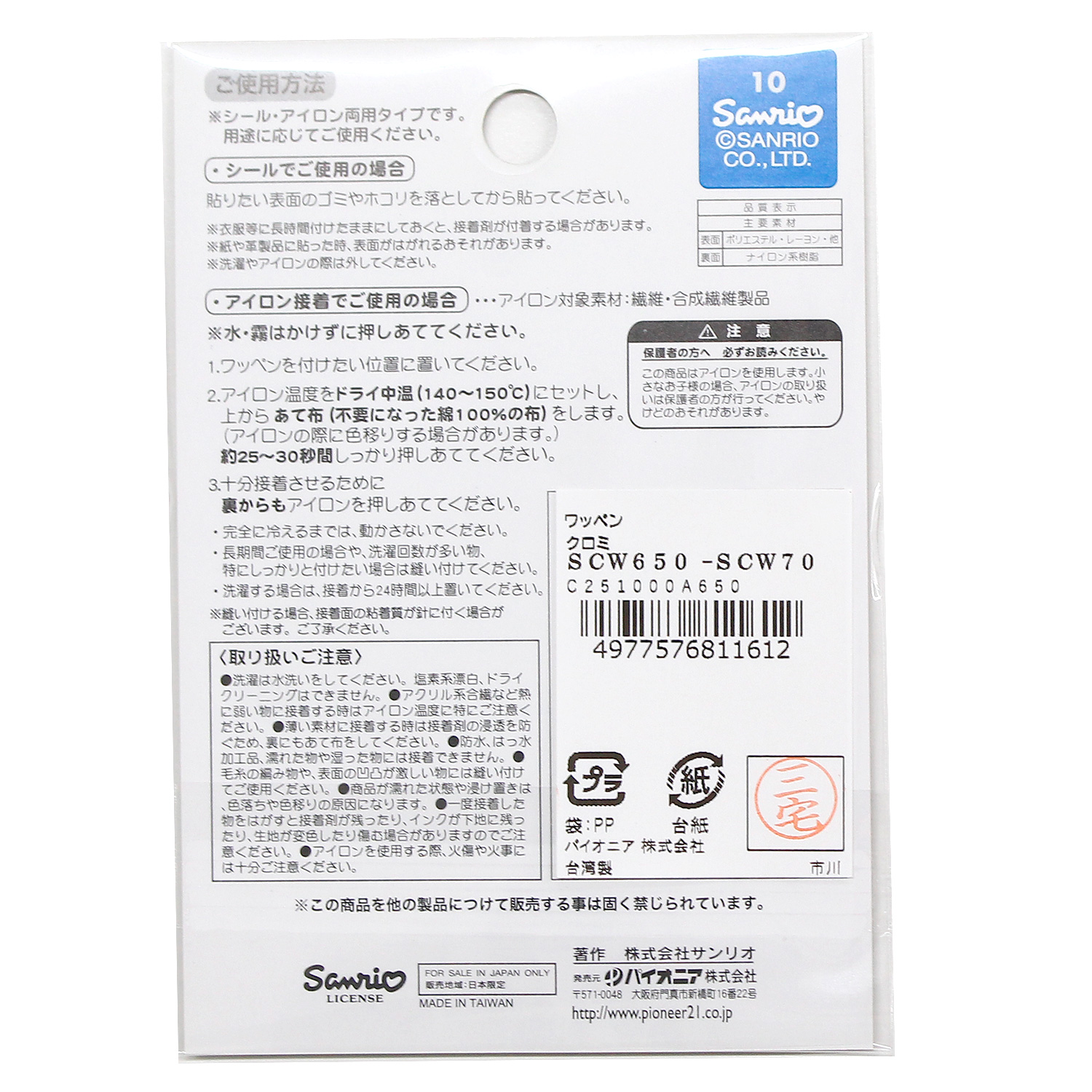 SCW650 パイオニア サンリオキャラクターズ むきゅむきゅ 2個付きワッペン シール・アイロン両用タイプ (枚)
