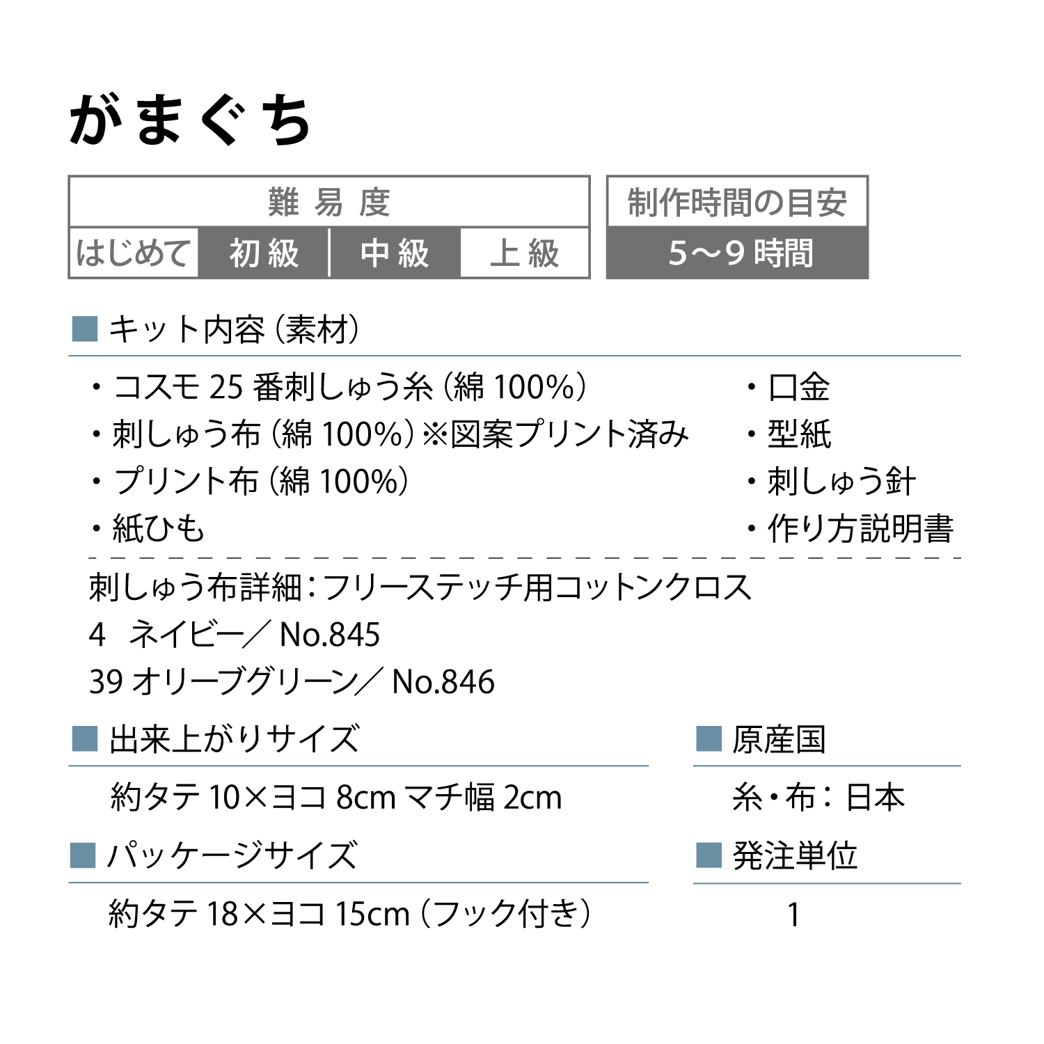 ■セット内容:刺しゅう糸、刺しゅう布(図案プリント済み)、プリント布、刺しゅう針、口金、紙ひも、作り方説明書