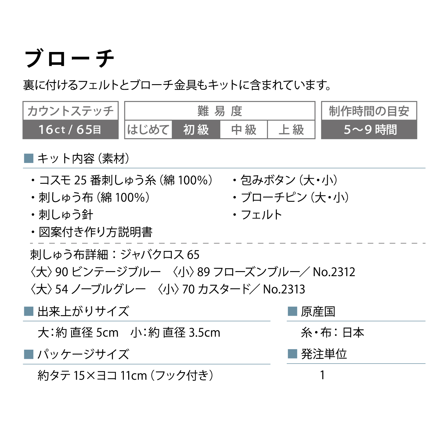 ■キット内容:25番刺しゅう糸、包みぼたん、刺しゅう布、ブローチピン、刺しゅう針、フェルト、作り方